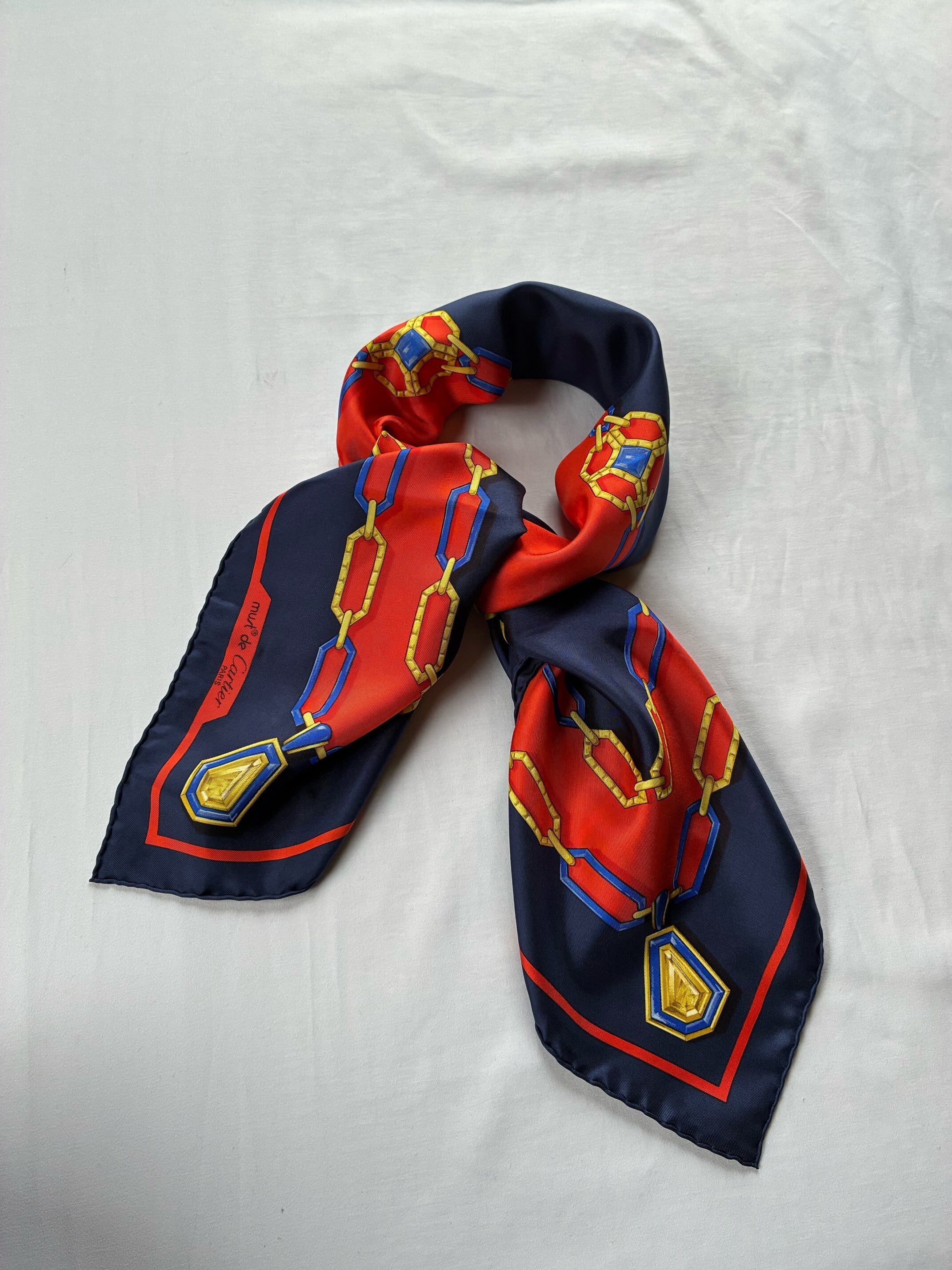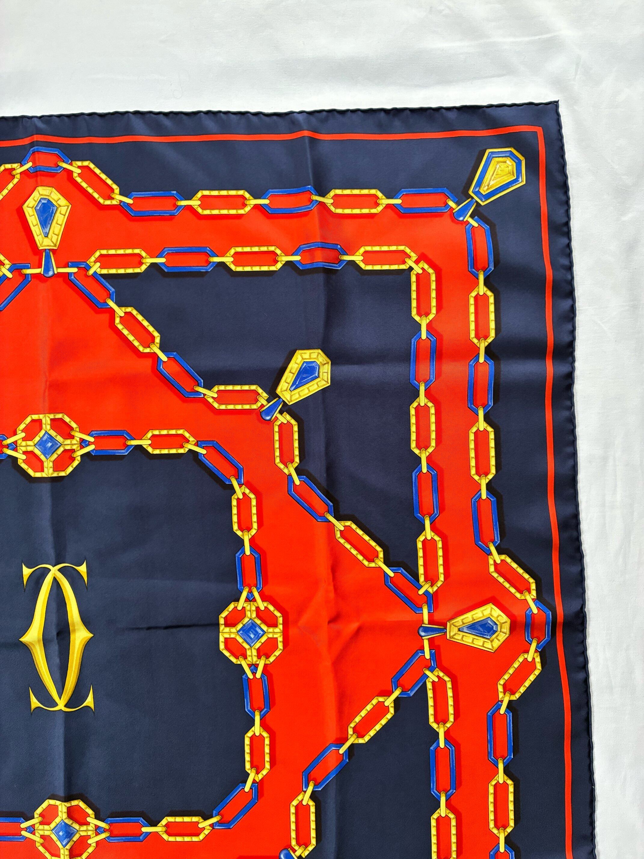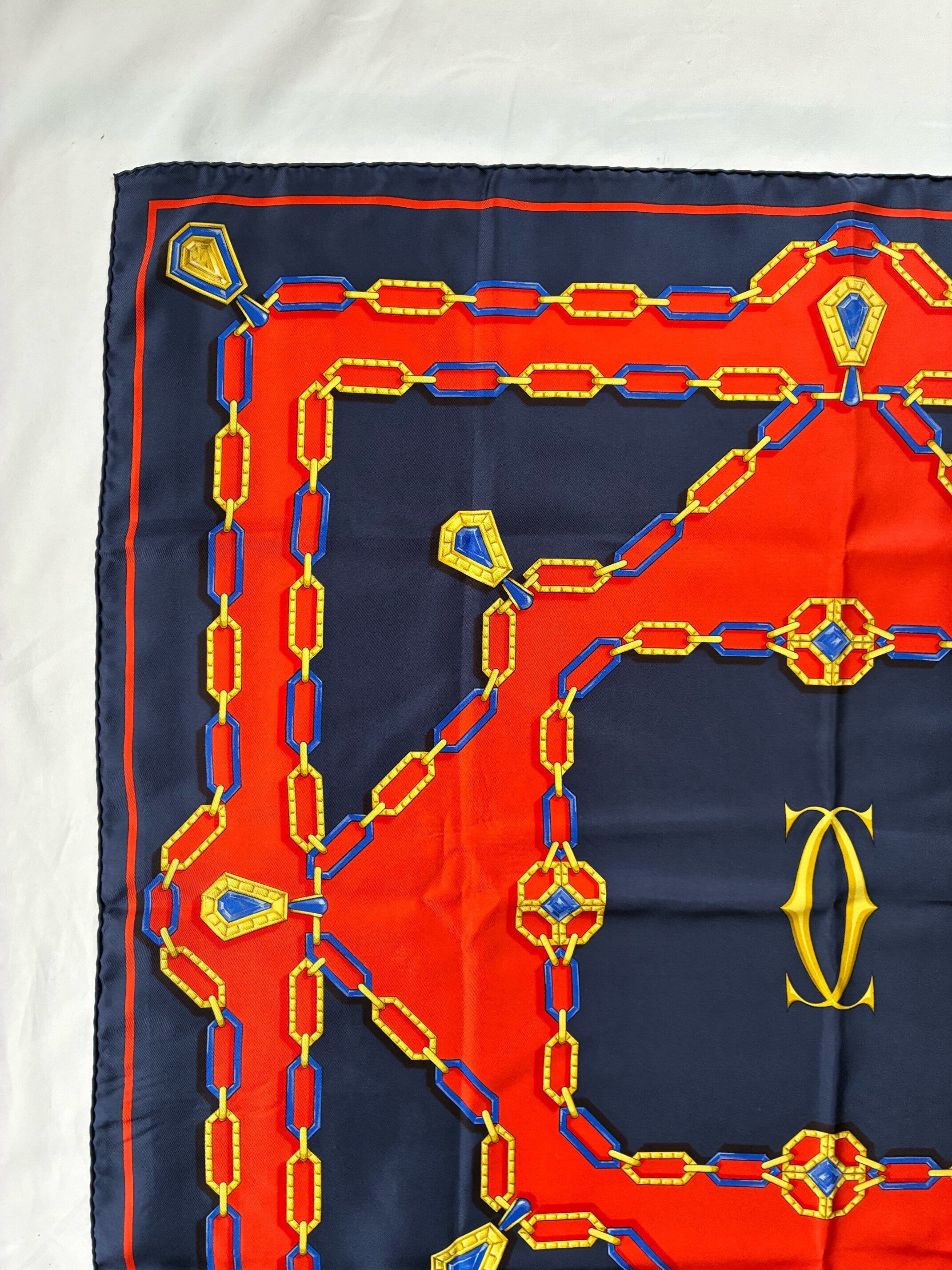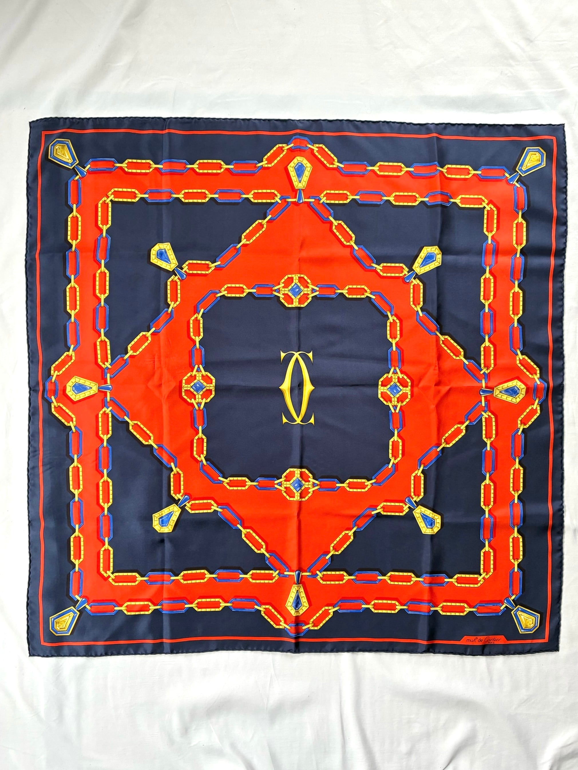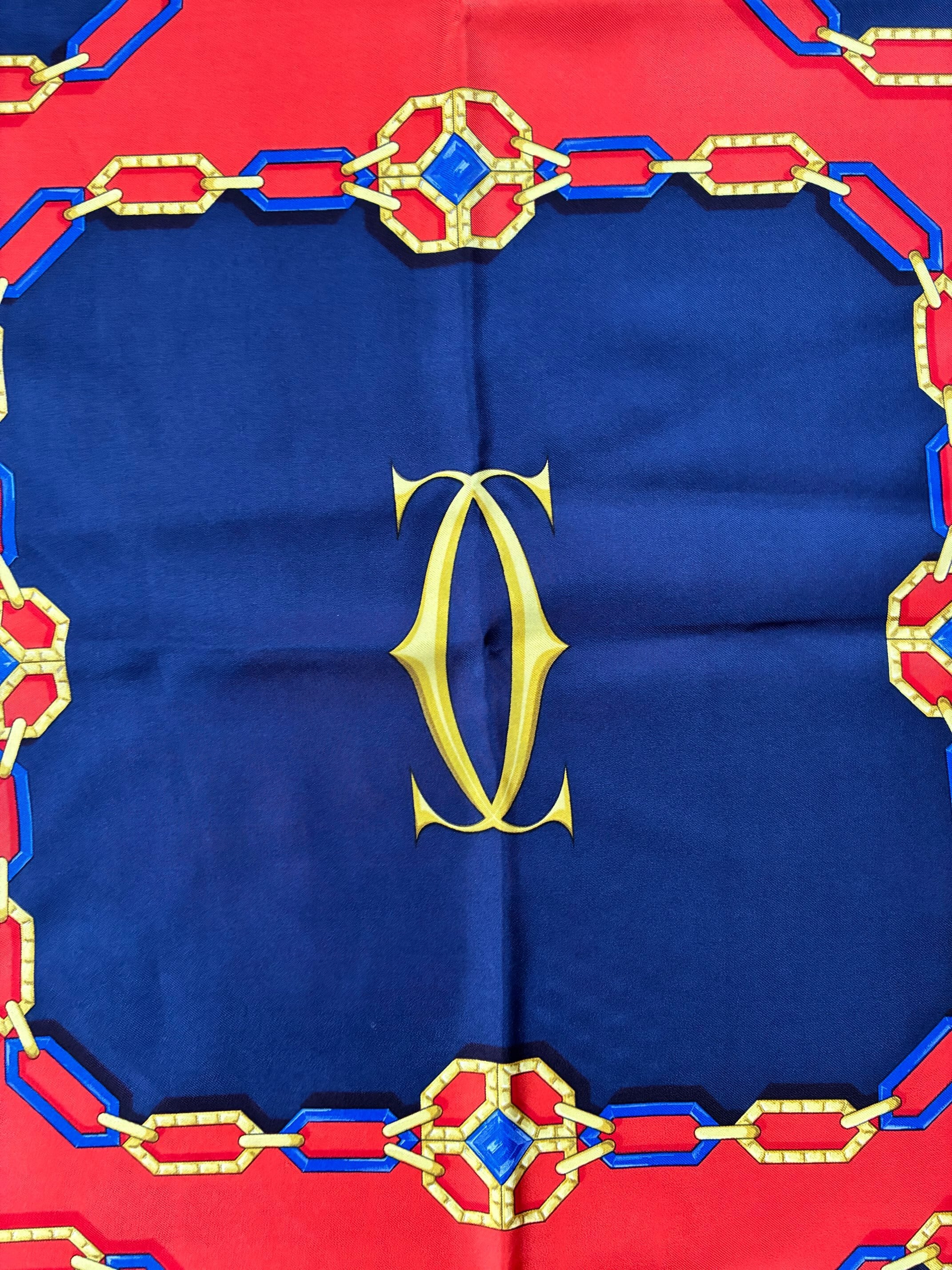 センターのゴールドロゴが目をひくCartier Vintage スカーフ。Dk. NavyとRedのバイカラーがクラシッ クなカラーリング。ゴールドとブルーのチェーンモチーフも華やかな存在感の一枚です。