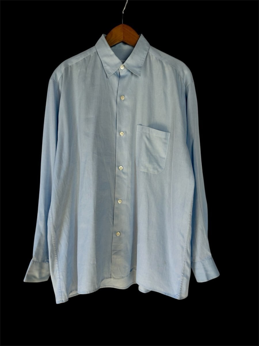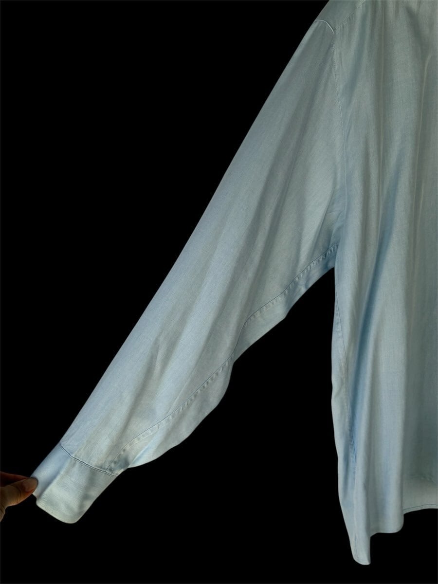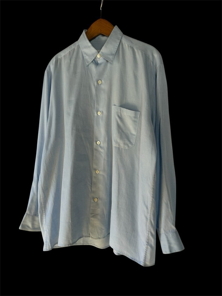 淡い水色のカラーがさわやかなagnes'bメンズシャツ。程良いハリのある生地感が清潔感のある一枚。レディースのハオリとしてもオススメ☆