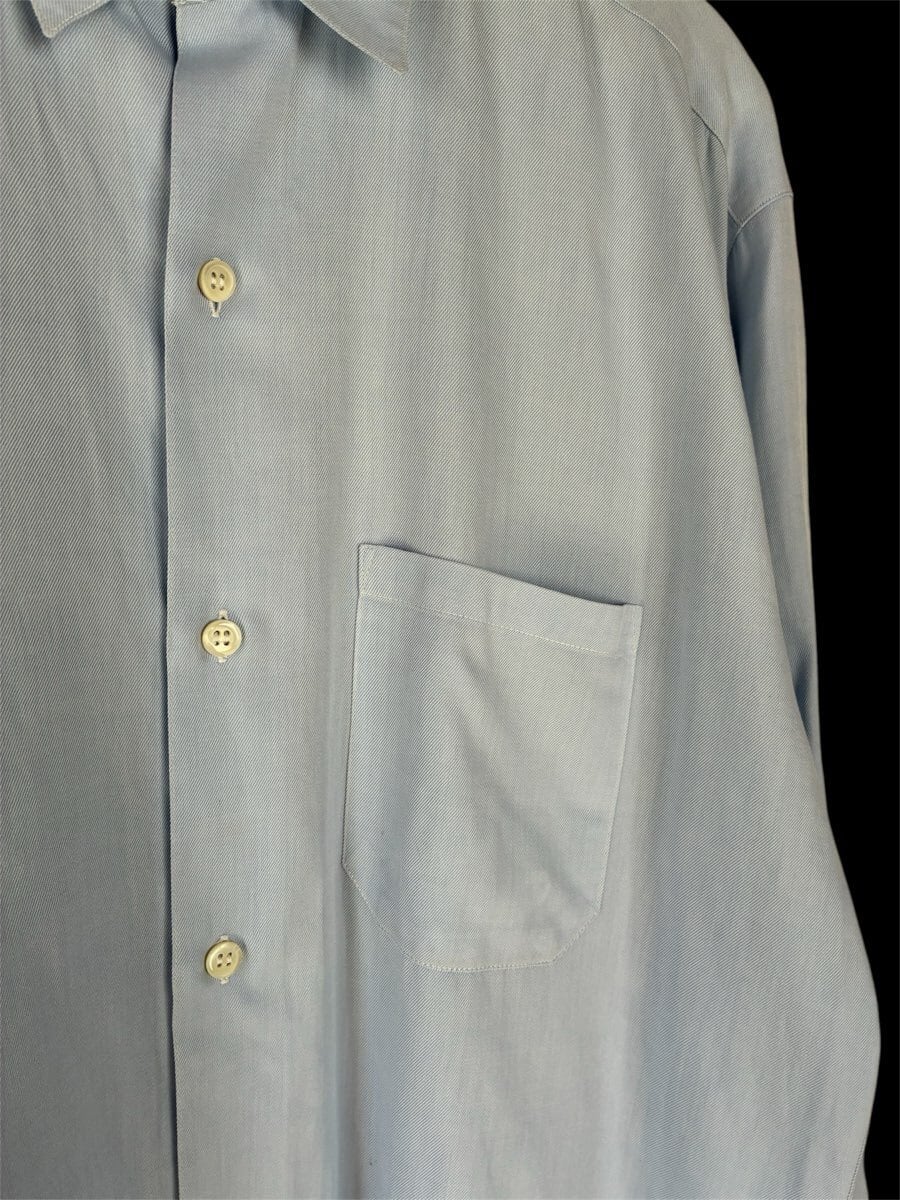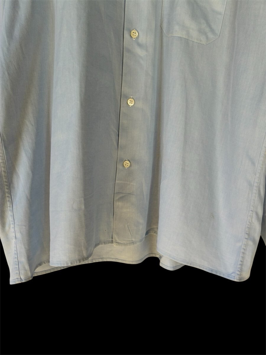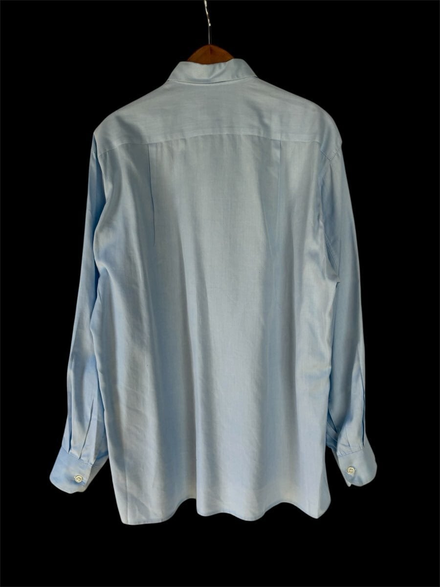 淡い水色のカラーがさわやかなagnes'bメンズシャツ。程良いハリのある生地感が清潔感のある一枚。レディースのハオリとしてもオススメ☆