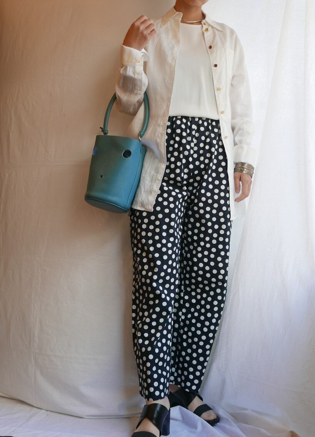 ゴールドのエルメスロゴボタンで引き締まる大人っぽいシャツ。