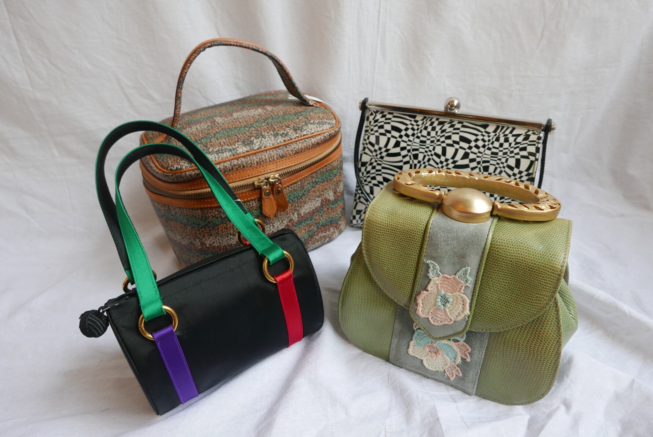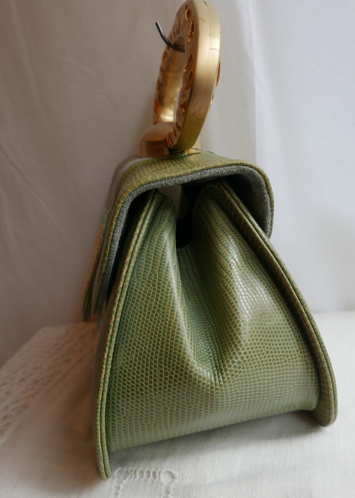 Italy グリーンレザー 花モチーフ ハンドバッグ!