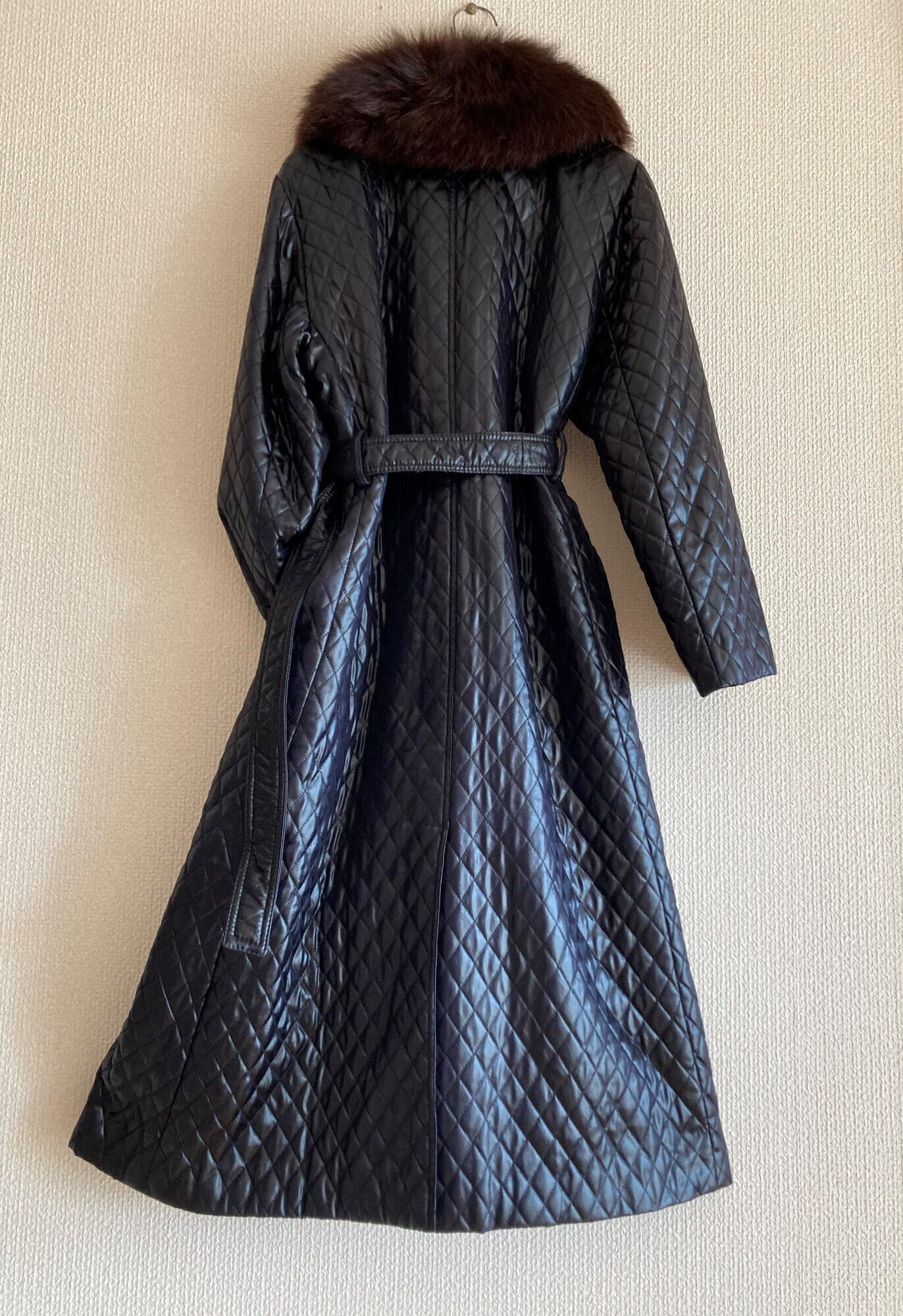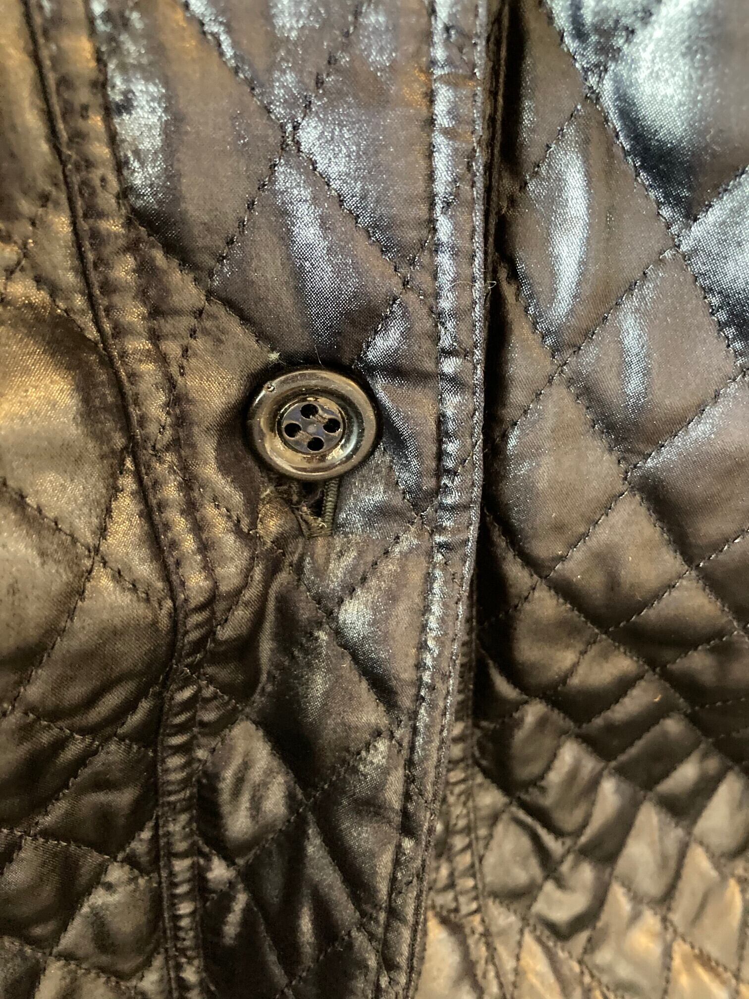 光沢感のあるキルティングの細めなAラインコート。程よいゴージャス感がたまらない可愛いさ。