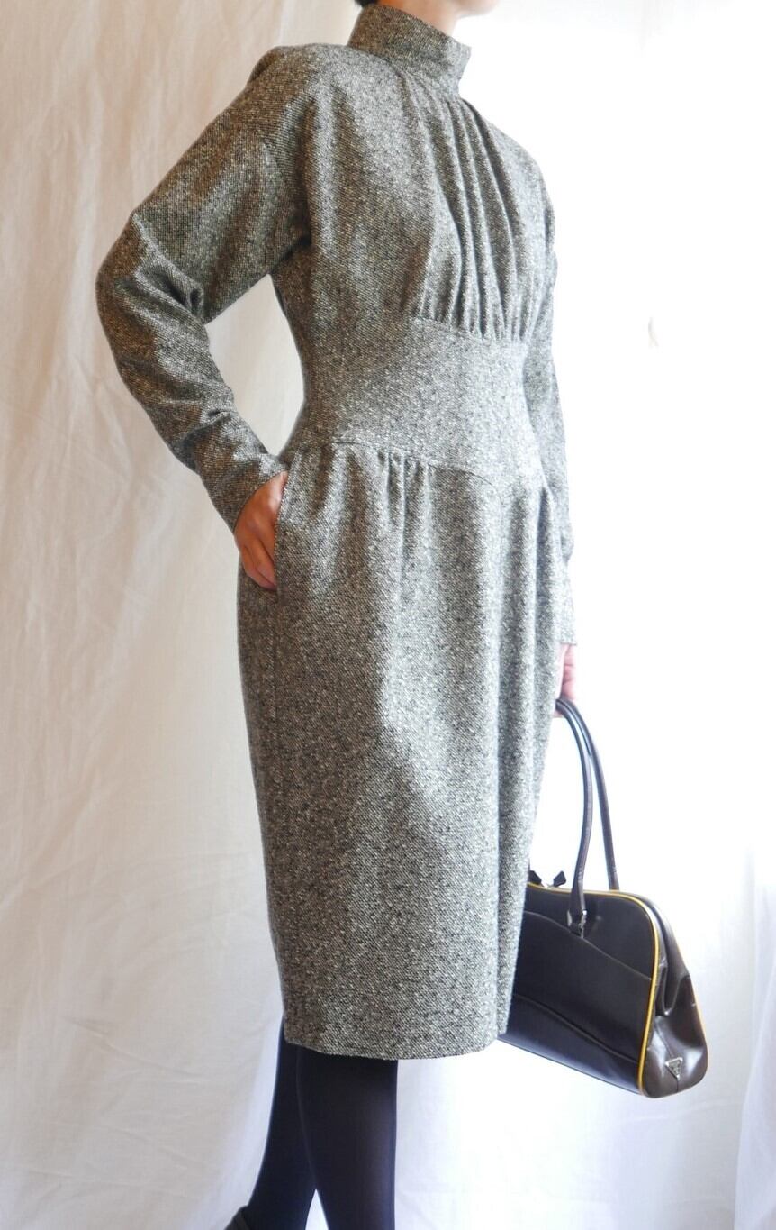 ハイネックのギャザーが美しい、モード感満載のシルエット