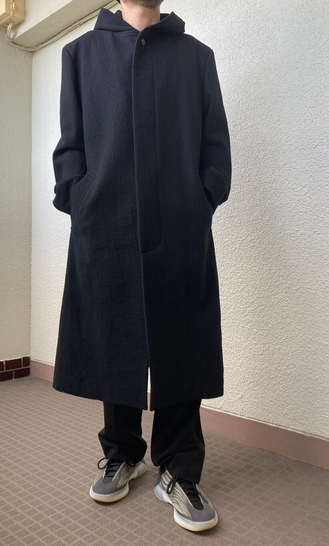 フーディーがポイントなISSEYのブラックロングコート