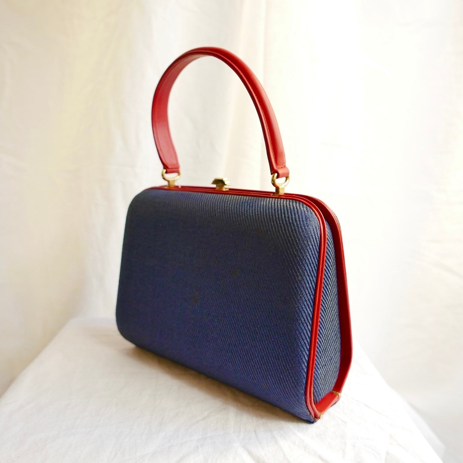 ネイビーの生地に赤レザー, 春バイカラーのテンションが上がるとても上品なハンドバック