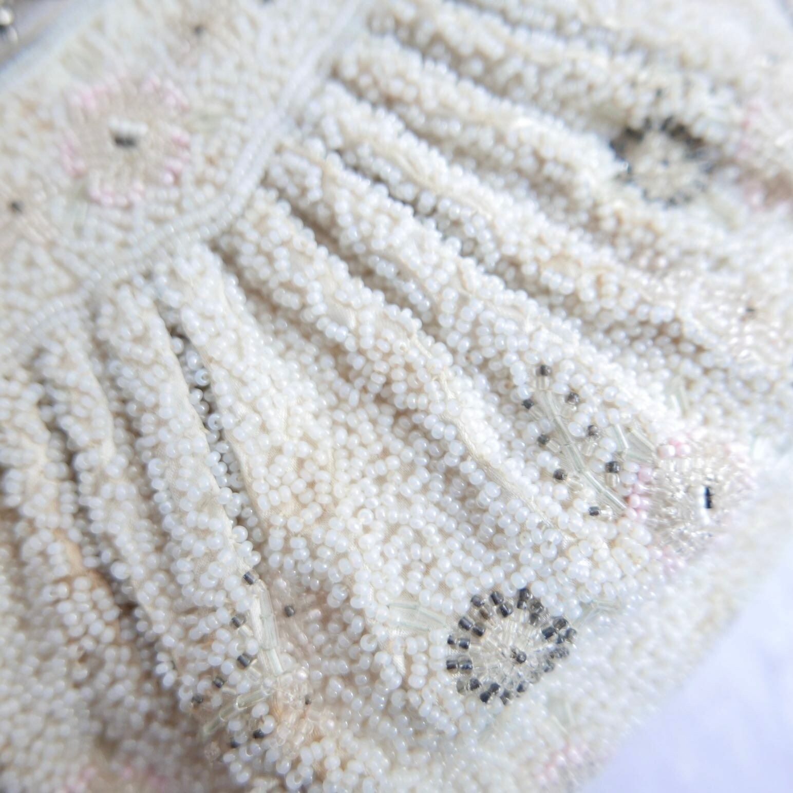 細かく繊細なビーズに、丸く膨らんだギャザーのシェイプとがま口が、クラッシックな可愛さ。