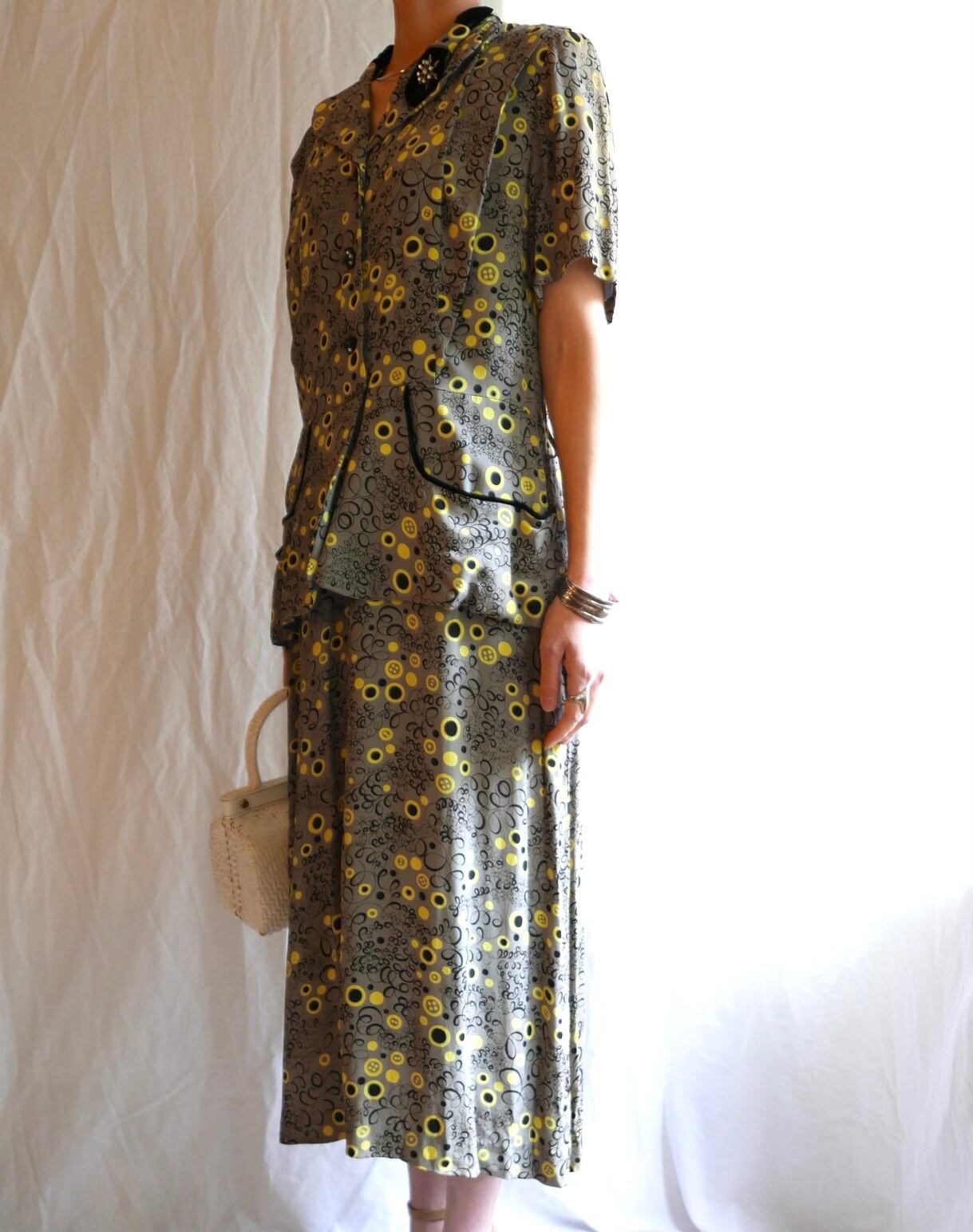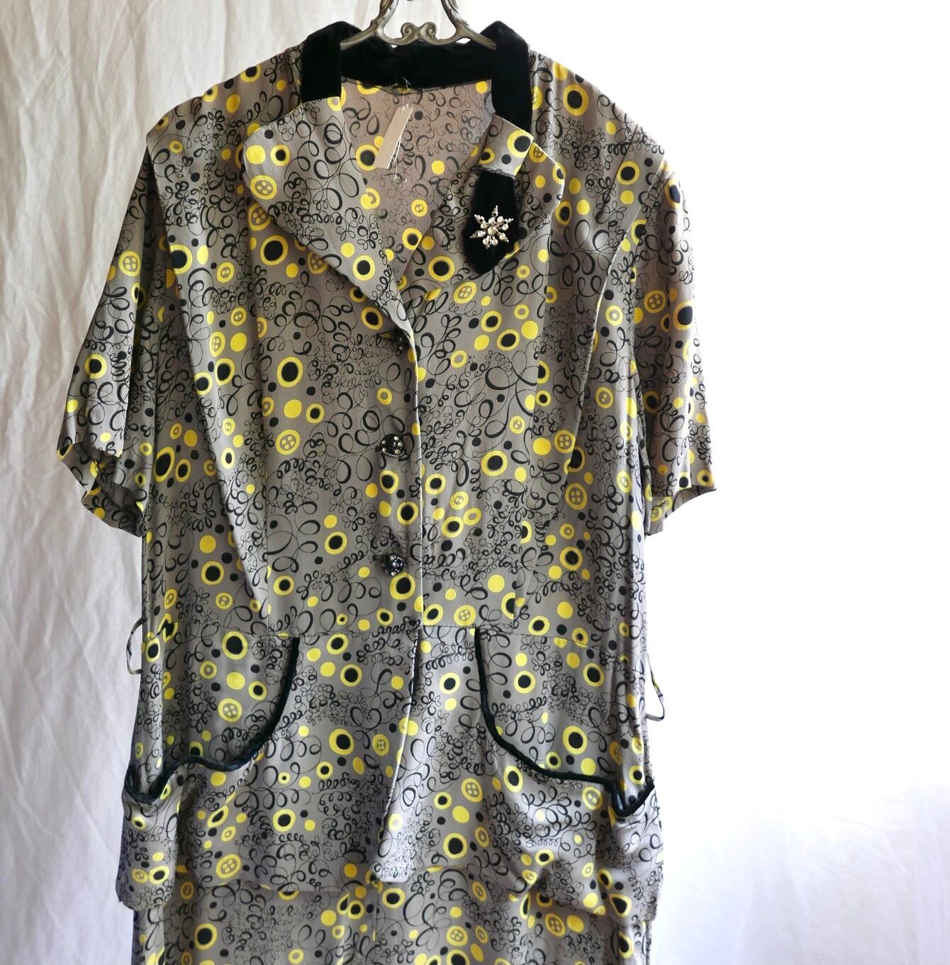 グレーにイエローの抽象的なサークルグラフィックがモダンなワンピース