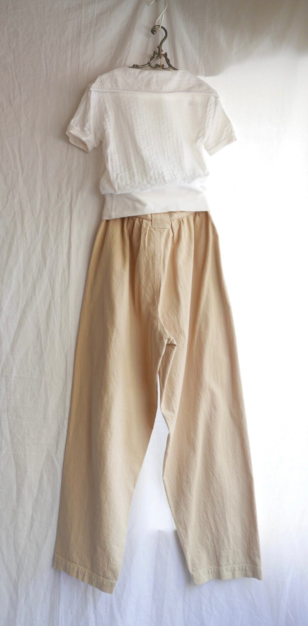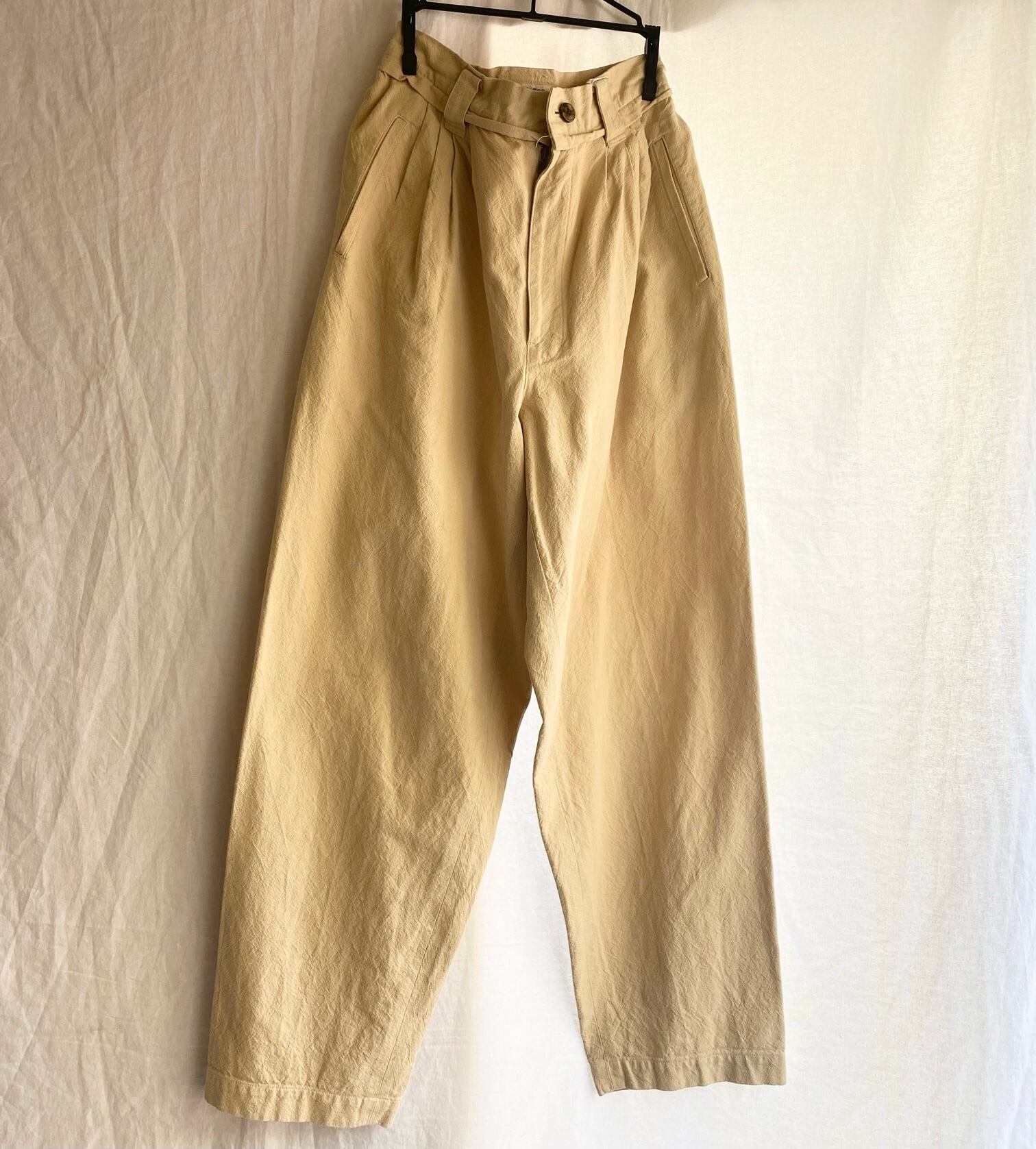 洗いざらしのようなざっくりとした質感のコットンにテーパードシルエットが綺麗なタックパンツです☆