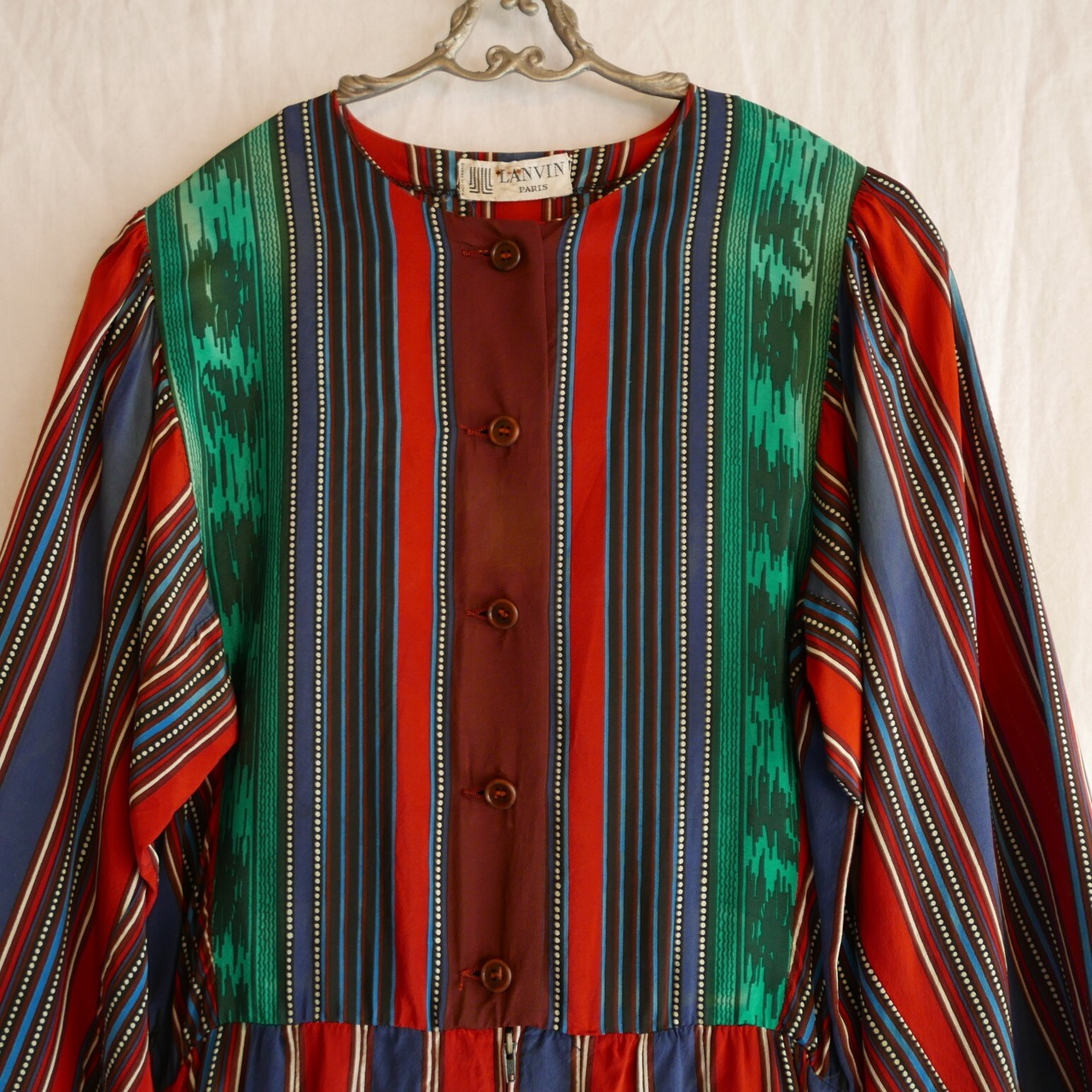 赤とネイビーのストライプに白ドット、グリーンのジオメトリック柄の組み合わせが絶妙にマッチした、LANVINの70-80’sビンテージ・ワンピース。肩や袖などの程よいギャザーがヒッピーテイストもあり、上品さもあり。。