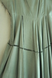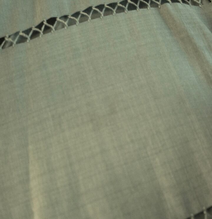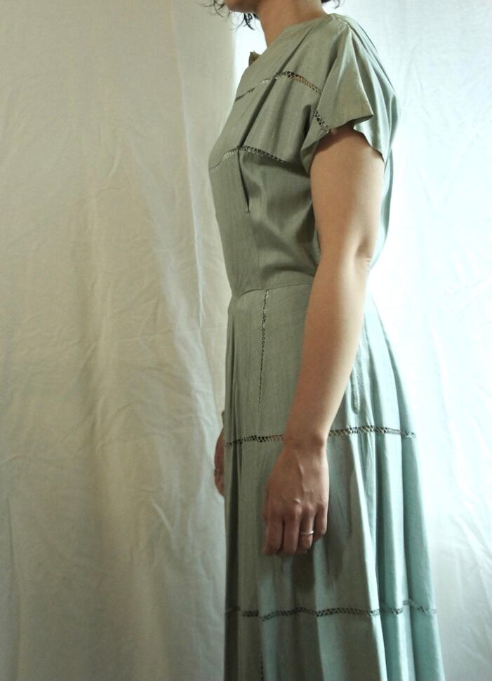 くすんだライトブルーに所々にカットワークのようなデザイン。ネックや体に沿うフレンチスリーブなど、とてもエレガント。