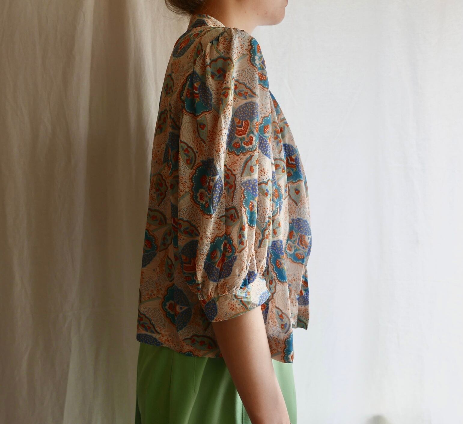 パフスリーブにボウタイデザイン、てろっとした柔らか生地で優しい印象・・