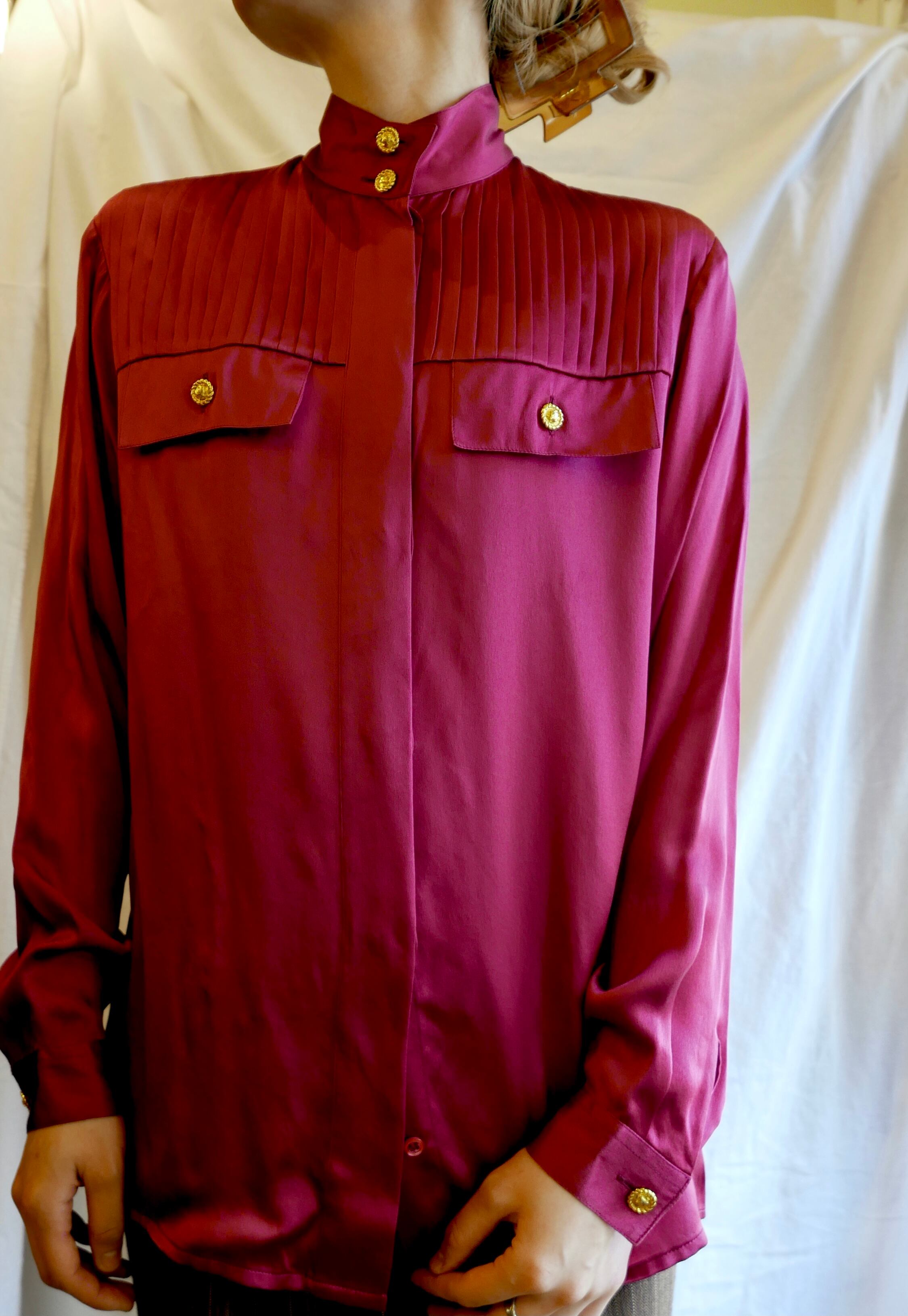 ゴールドメタルのマカダムボタン以外は"隠しボタン"仕様になっていたり、胸元だけギャザーになってたりと、とてもドレッシーな1990’s Celineのブラウス!