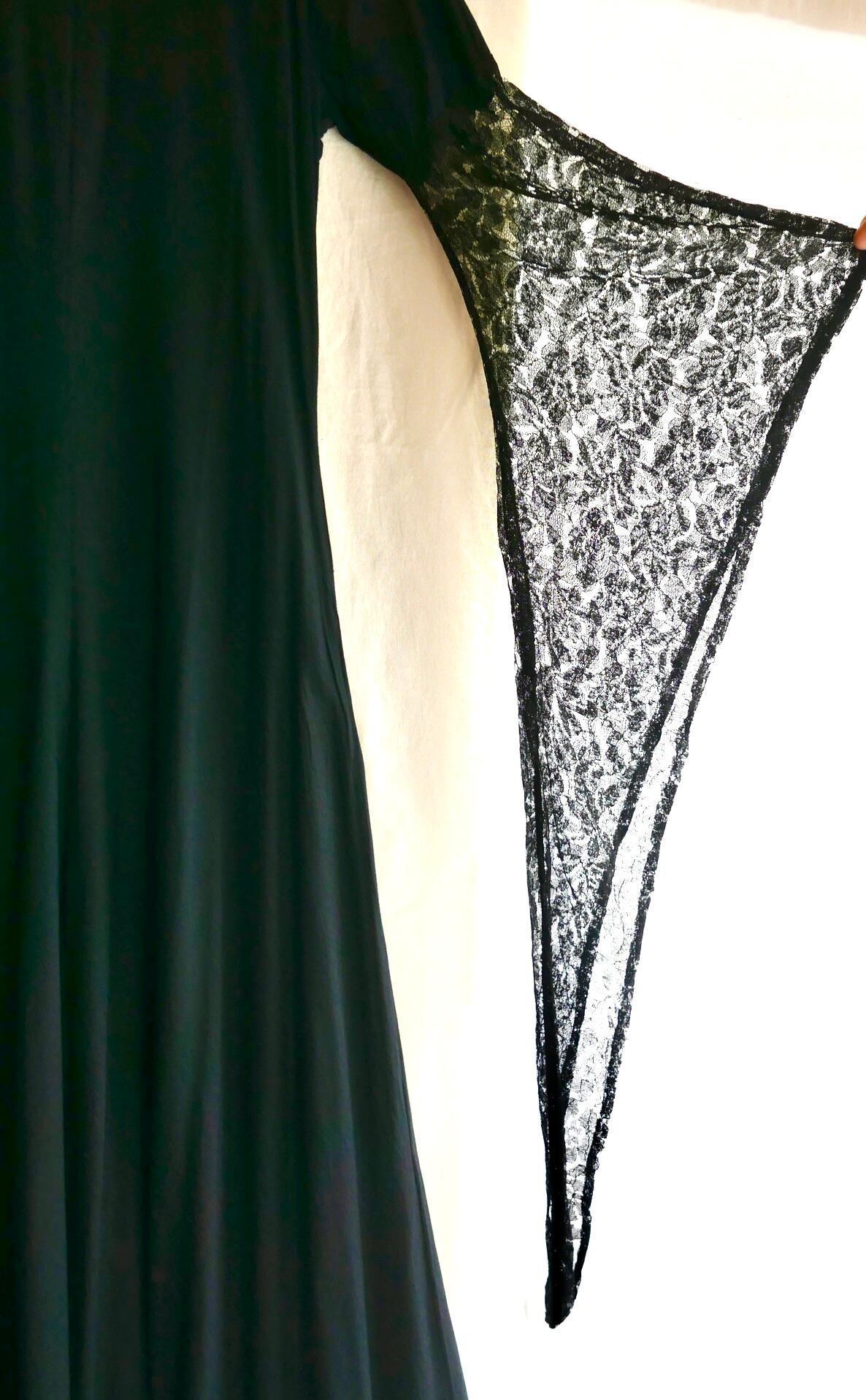 たらっとした柔らかい素材のあラインワンピースに、美しい黒レースの袖がモード感があります。