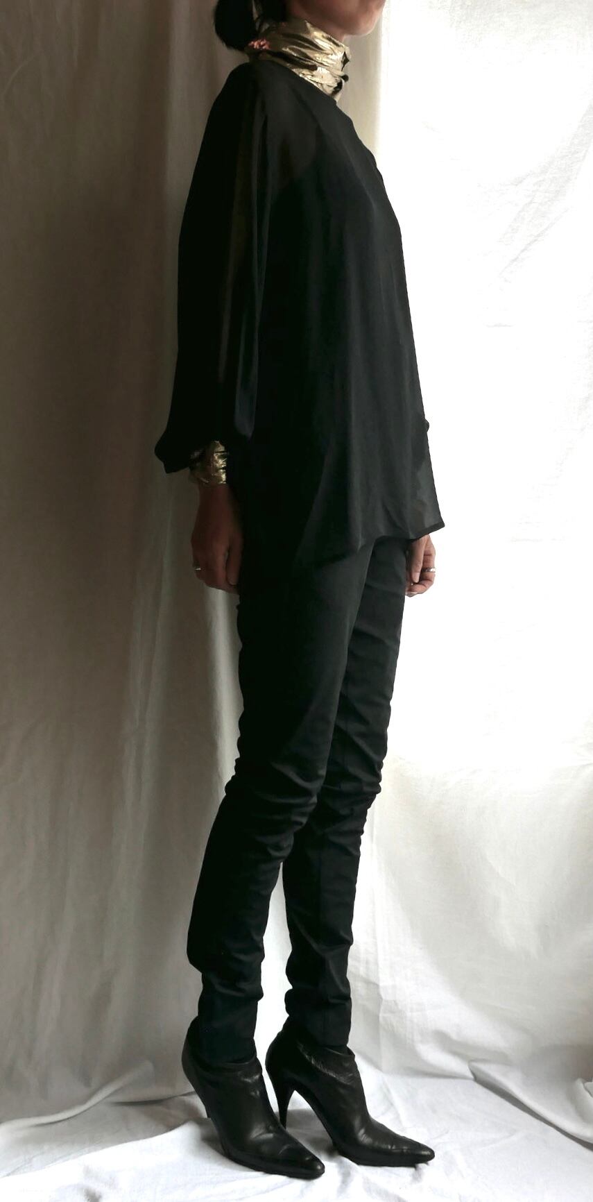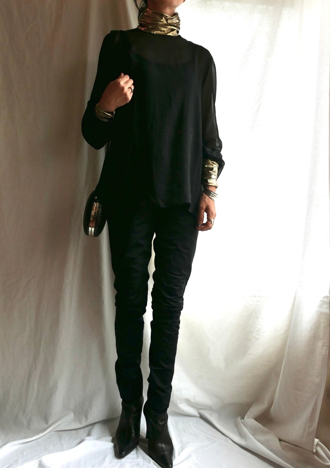 黒のシルクシースルーにクシャッとしたゴールドの衿&袖が斬新!