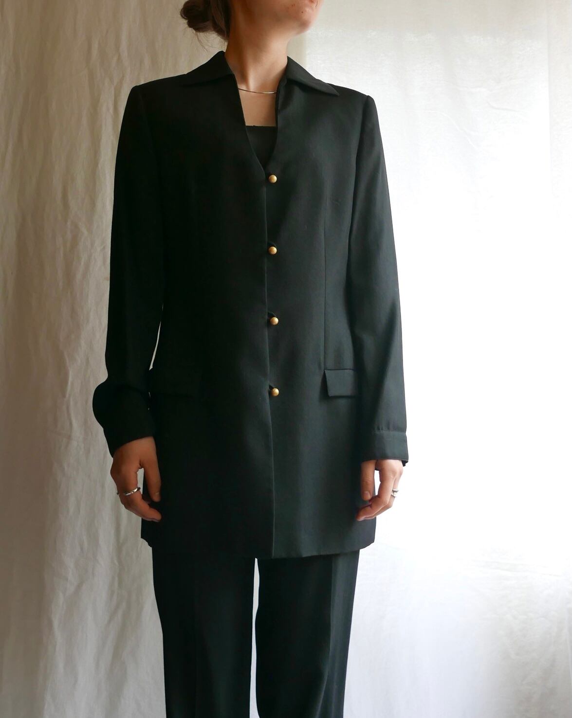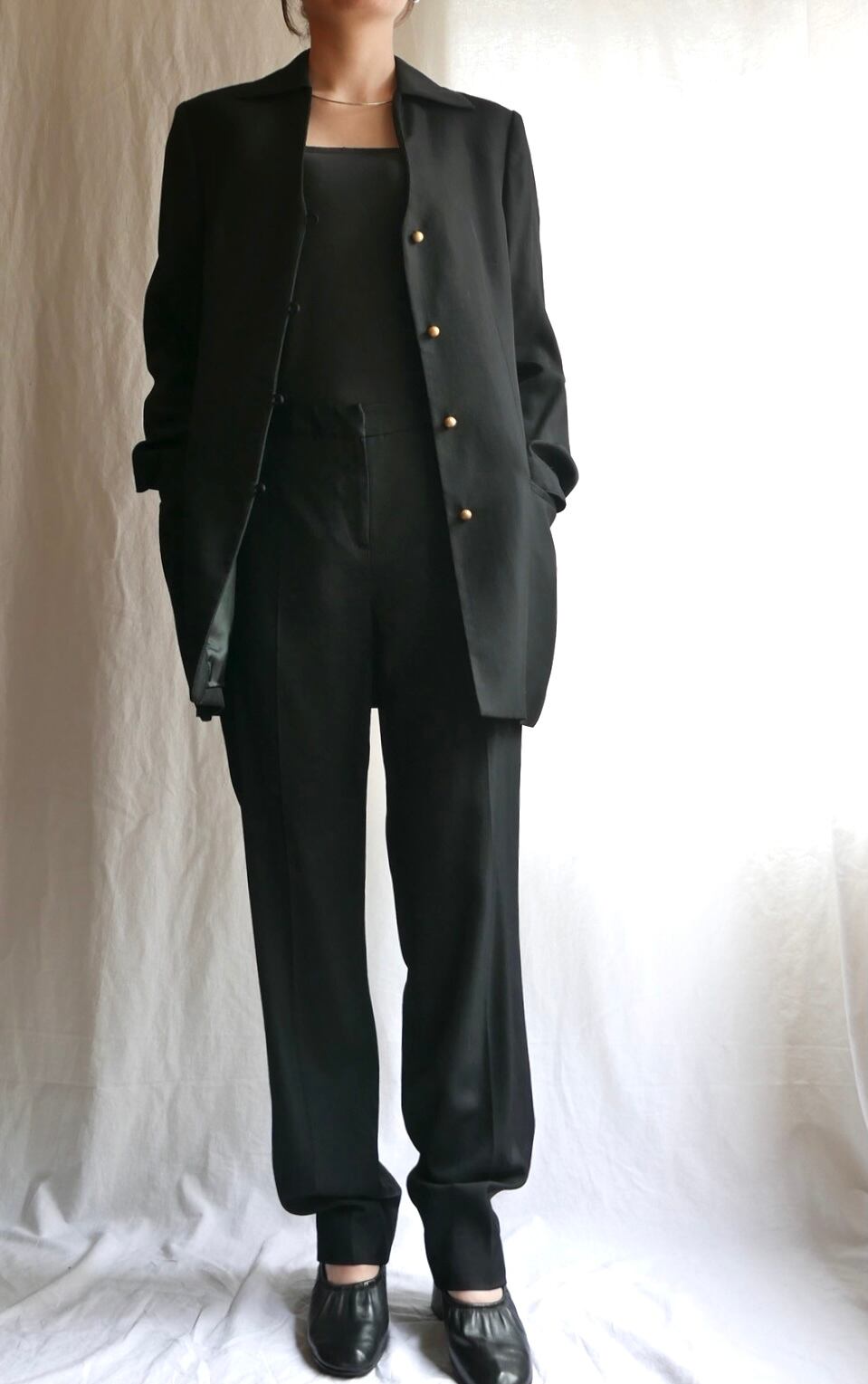 ジャケットの丈が長めでマニッシュな雰囲気ですが、ゴールドボタンにフェミニンさも感じる絶妙な一品☆