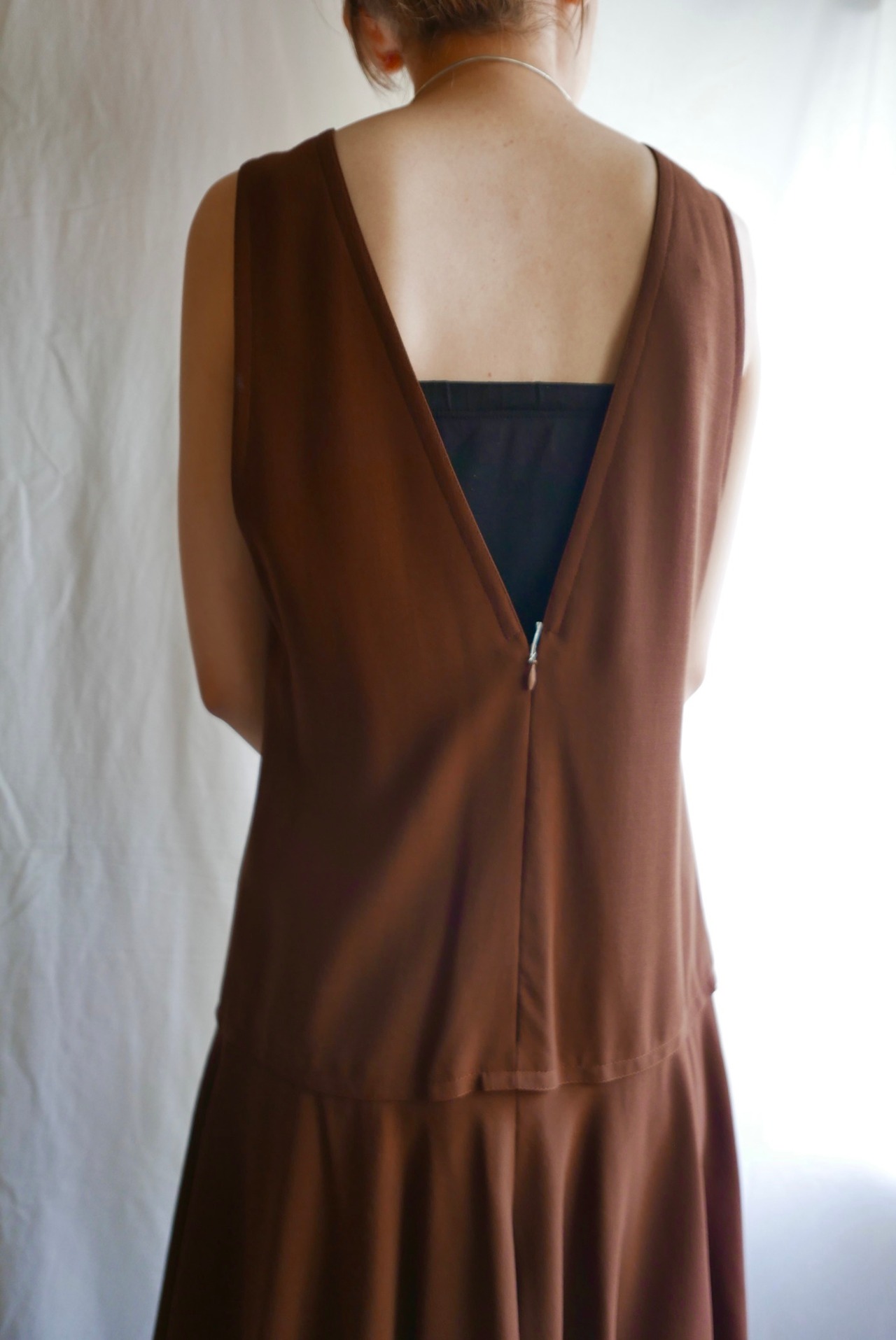 ワンピースの後ろのv字の大胆な空きも、気品があるデザイン!