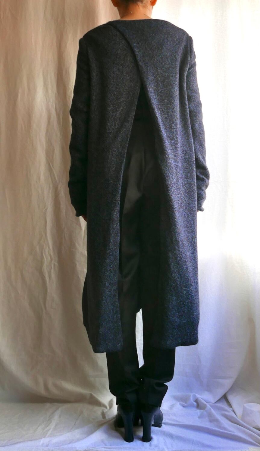 オーブンニットの様に分厚いニットで、バックデザインは彼の代名詞ともいえるアバンギャルドなカットが効いています
