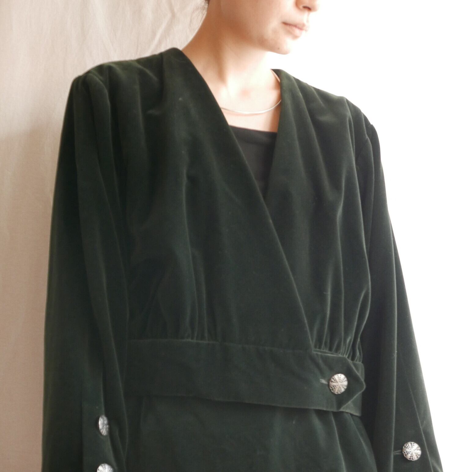 深緑の厚手の上質ベロアにギャザーのドレッシーなLINEが効いた、貴重な70年代YSL rivegaucheのセットアップ。