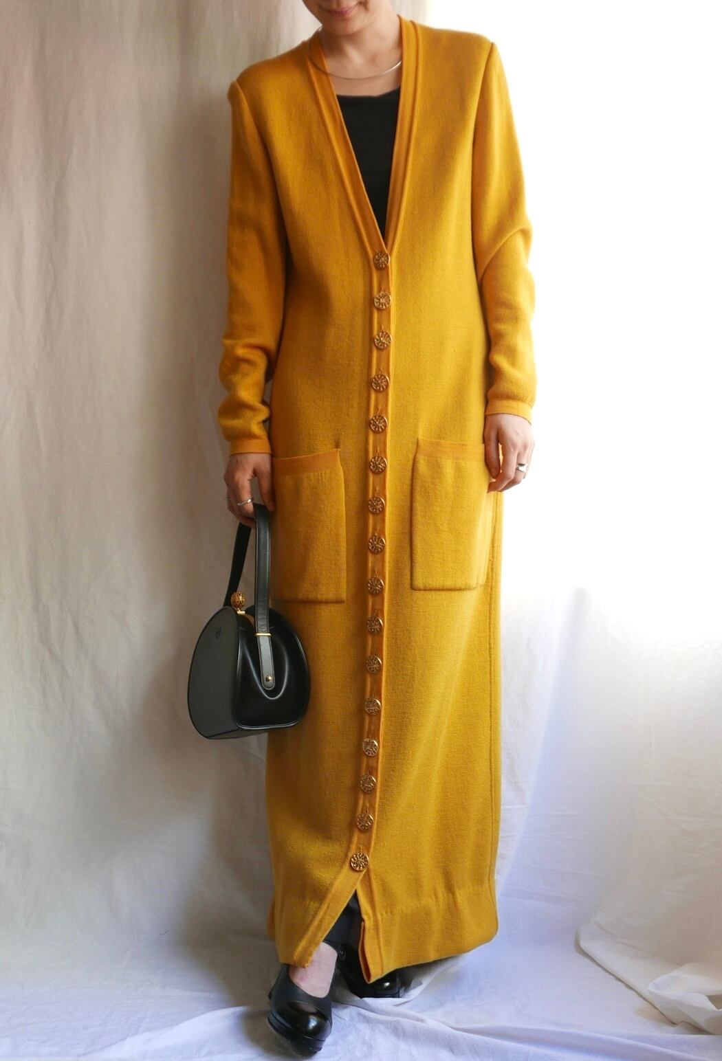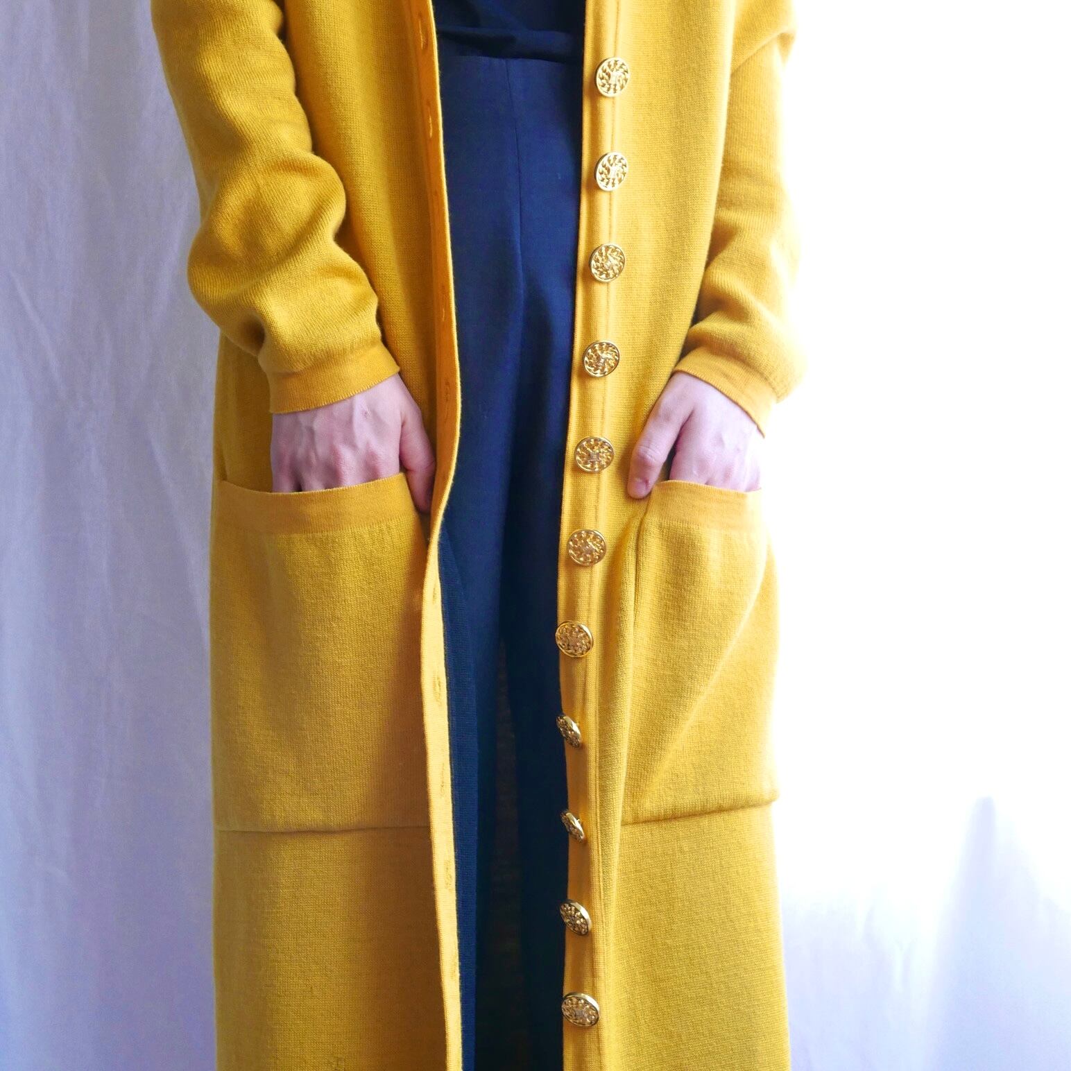 マカダムロゴのゴールドボタンが連続してレイアウトされたCELINEの超ロングニットコート、