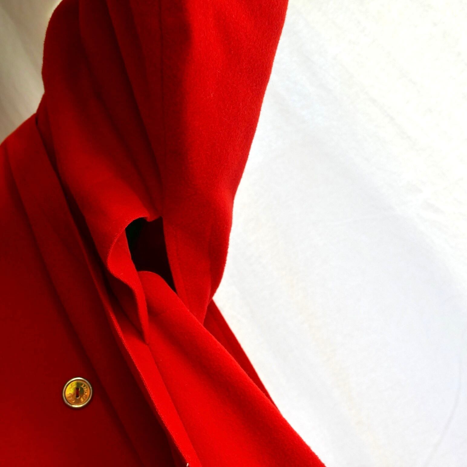 大胆なドルマンスリーブ、サイドのポケットや、脇の下のカッティング、身頃のサイドのかぶせた切り替え、えりも半分に折ったボタン使用。。とても凝ったデザインでモード感があります。