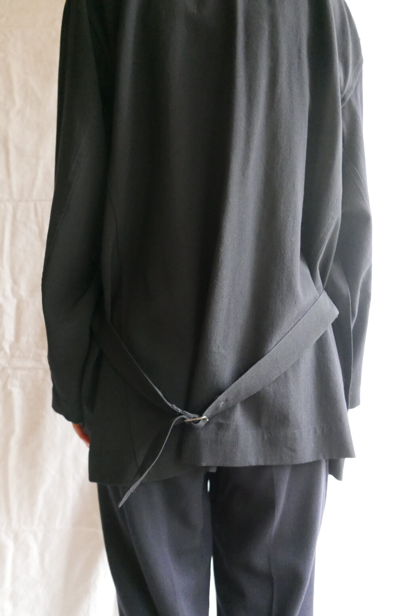 ノーカラーで無駄のないスッキリとした前面に、ベルトモチーフがクールな後ろ姿です
