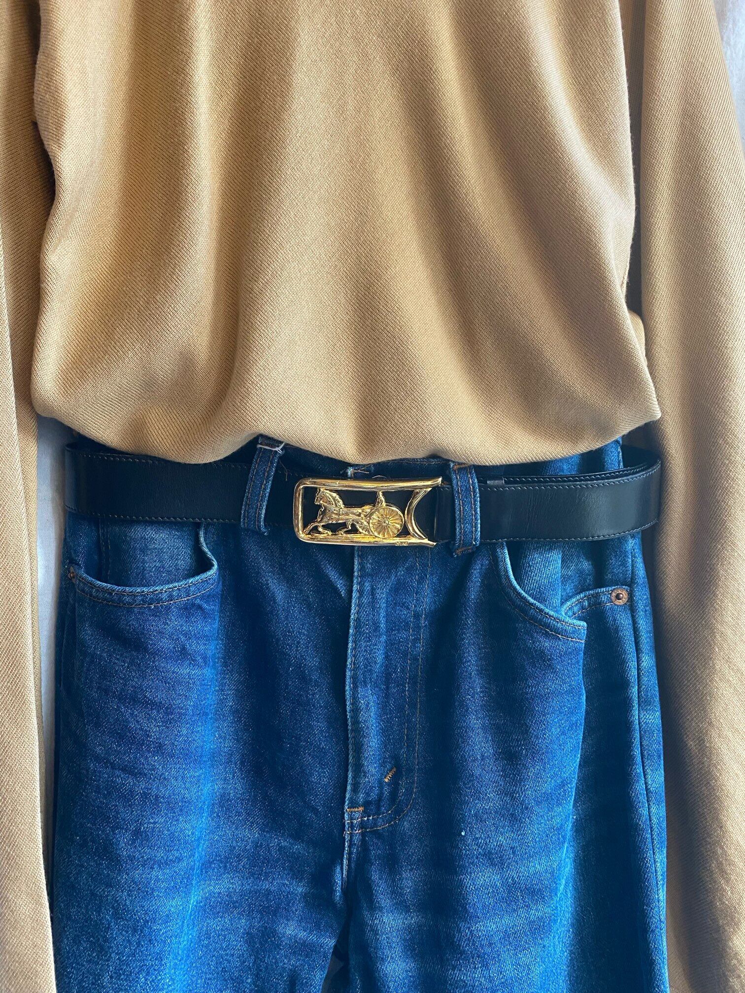 太目のベルトに大きな馬車ロゴが堂々たる存在感!