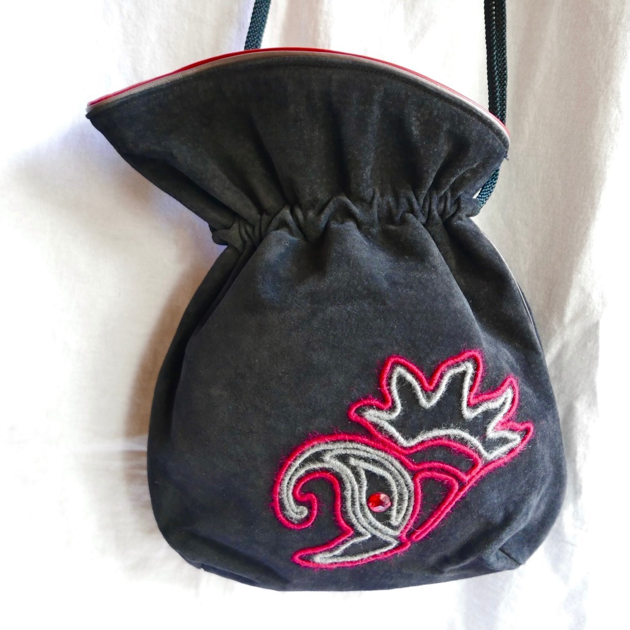 ブラックスエードに赤とグレーのレザーパイピングがモードなLANVIN巾着!