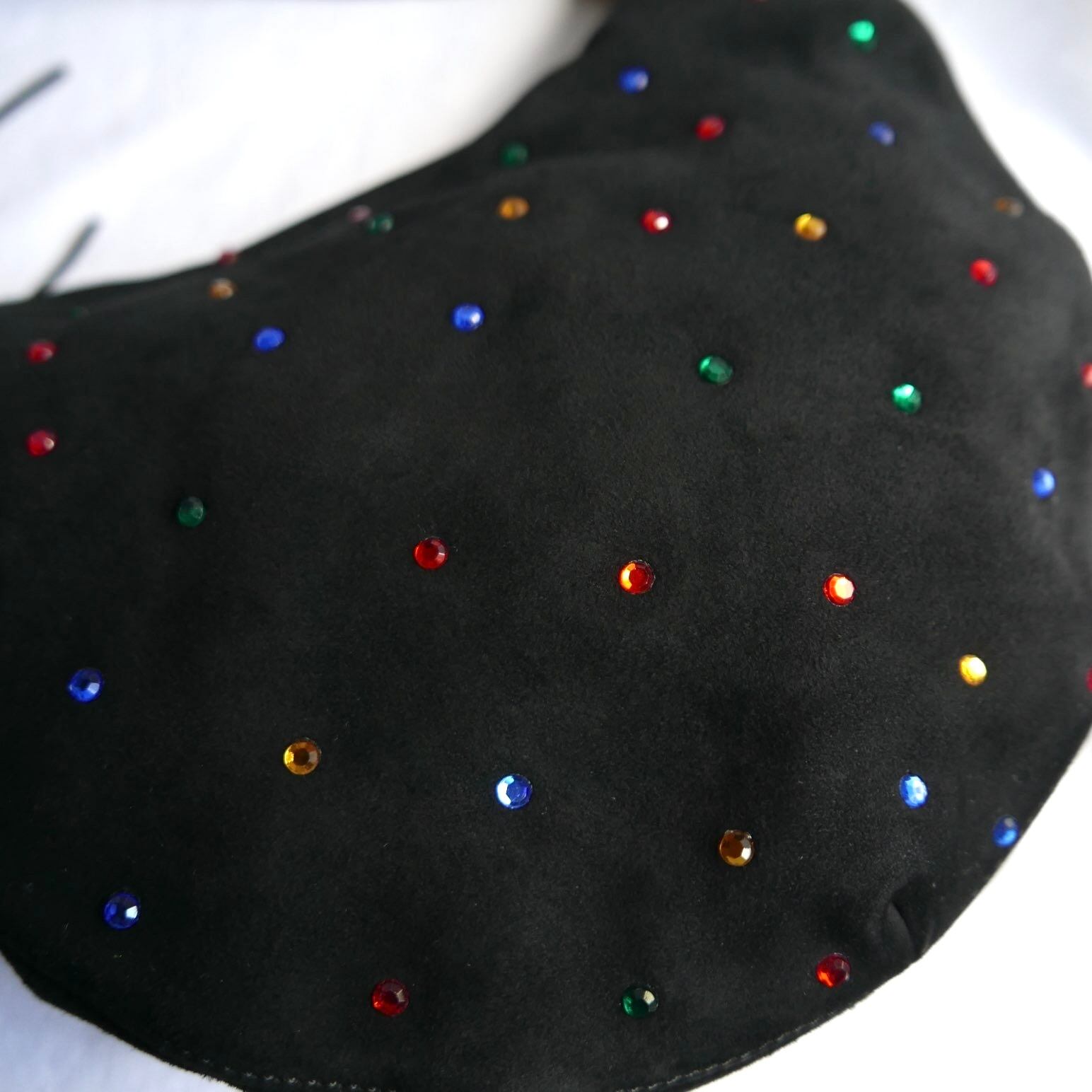 散りばめられたカラフルなラインストーンが,ブラックのスエード地に映えるハンドbag!