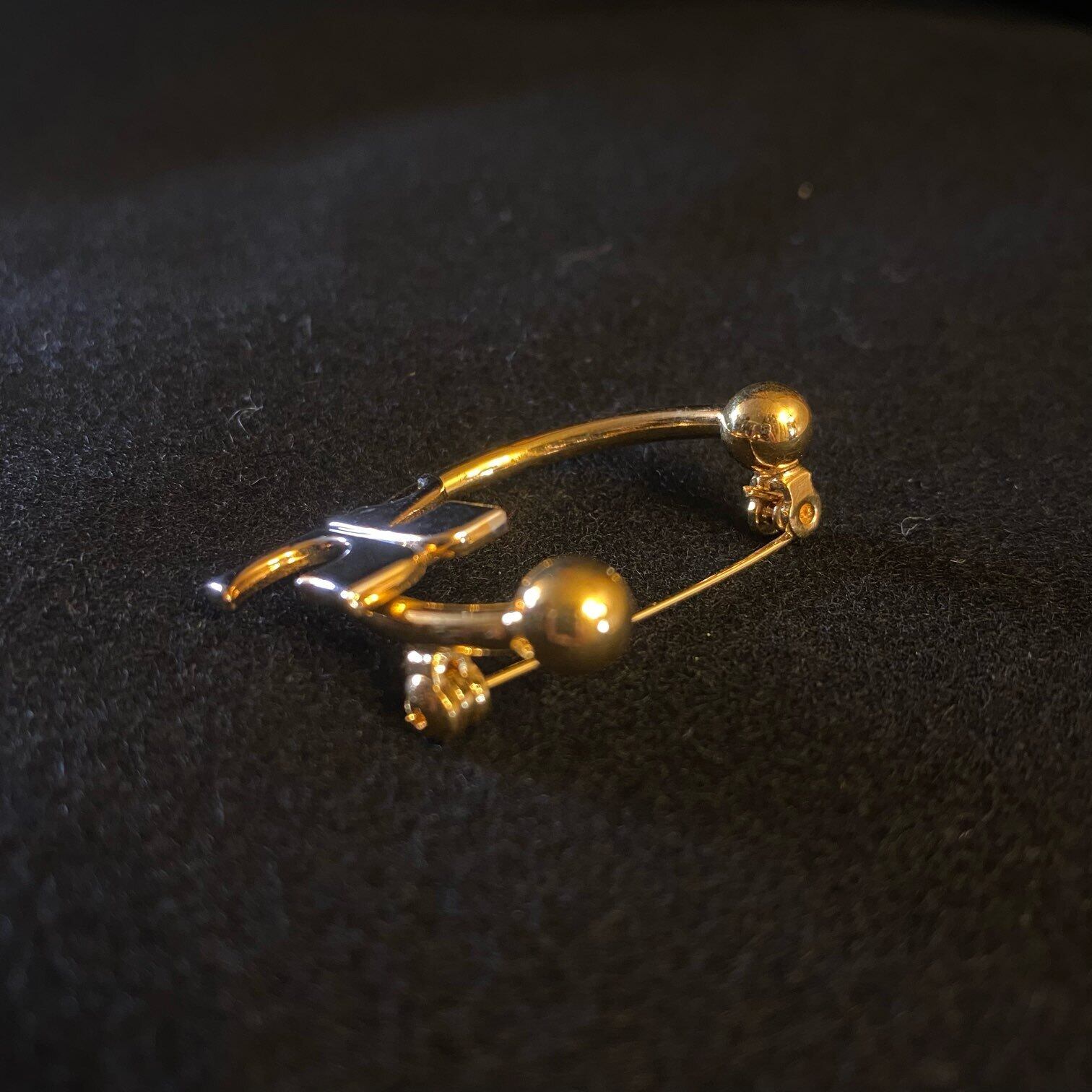 ゴールドの半円の中にシルバーのクレージュロゴが映えるブローチ!