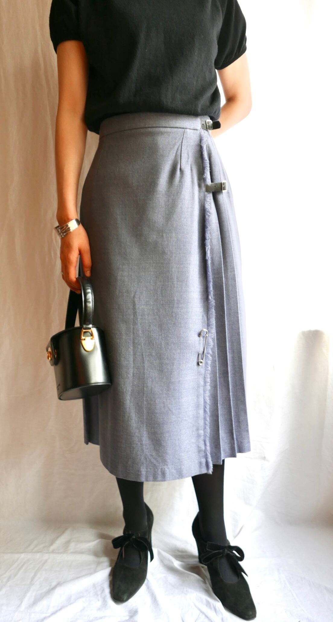 淡いブルーグレーの色味がノスタルジックな雰囲気のEnglandベルト付きラップスカート