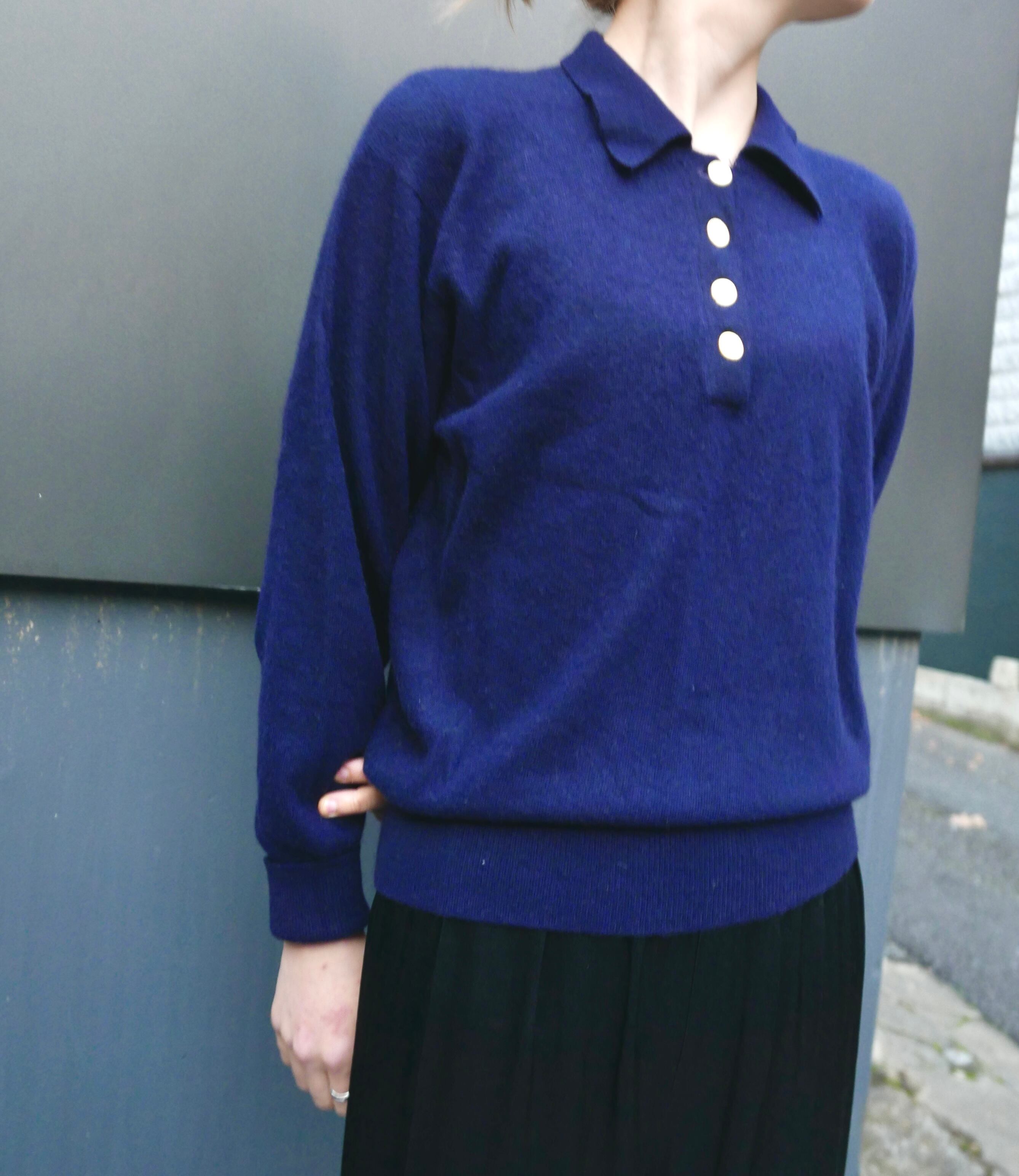 "HERMES PARIS"刻印のセリエゴールドボタンが、上品な色味のネイビーに映えるポロのニットセーター。