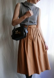 Courrage 60’s vintage, フエルトのような起毛がかった生地感があたたかい雰囲気のAラインスカート。細かい切り替えで、上品に広がるフレアにウッドボタンが控えめでキュン。。。