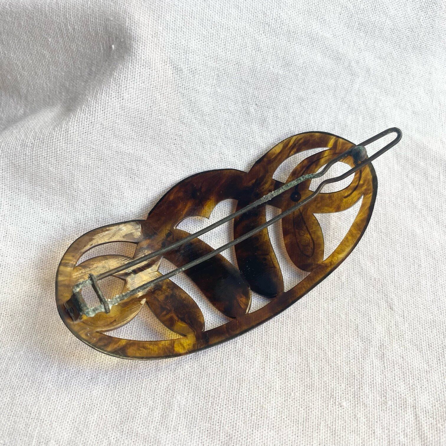 透け感のあるべっ甲風のカラーリングにラインストーンがキラッと輝くフランス1930年代のヘアバレッタ。細かく線画が手作業で施されていて、繊細な雰囲気がたまらない!