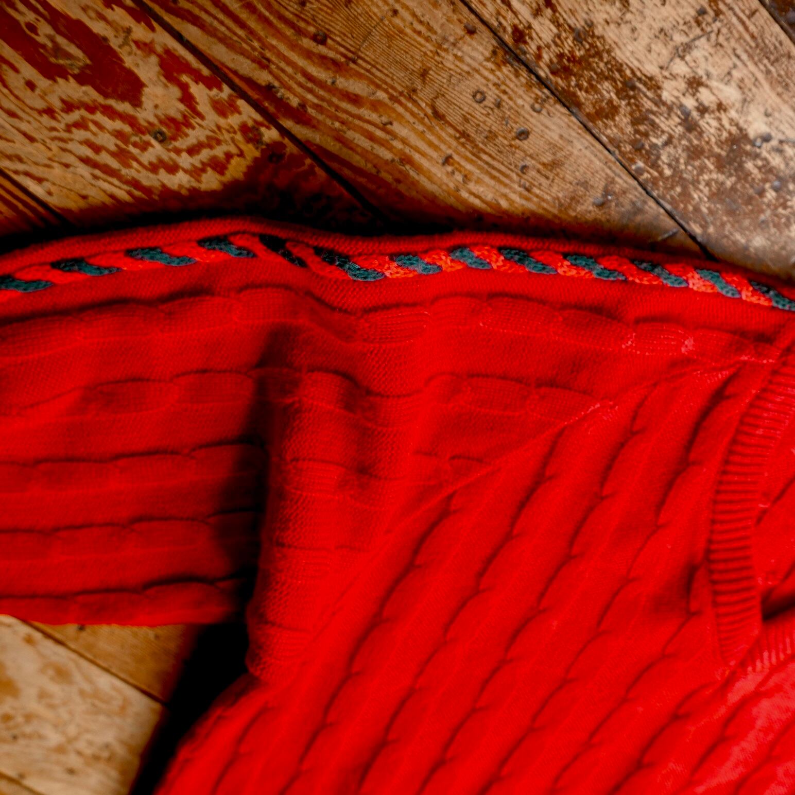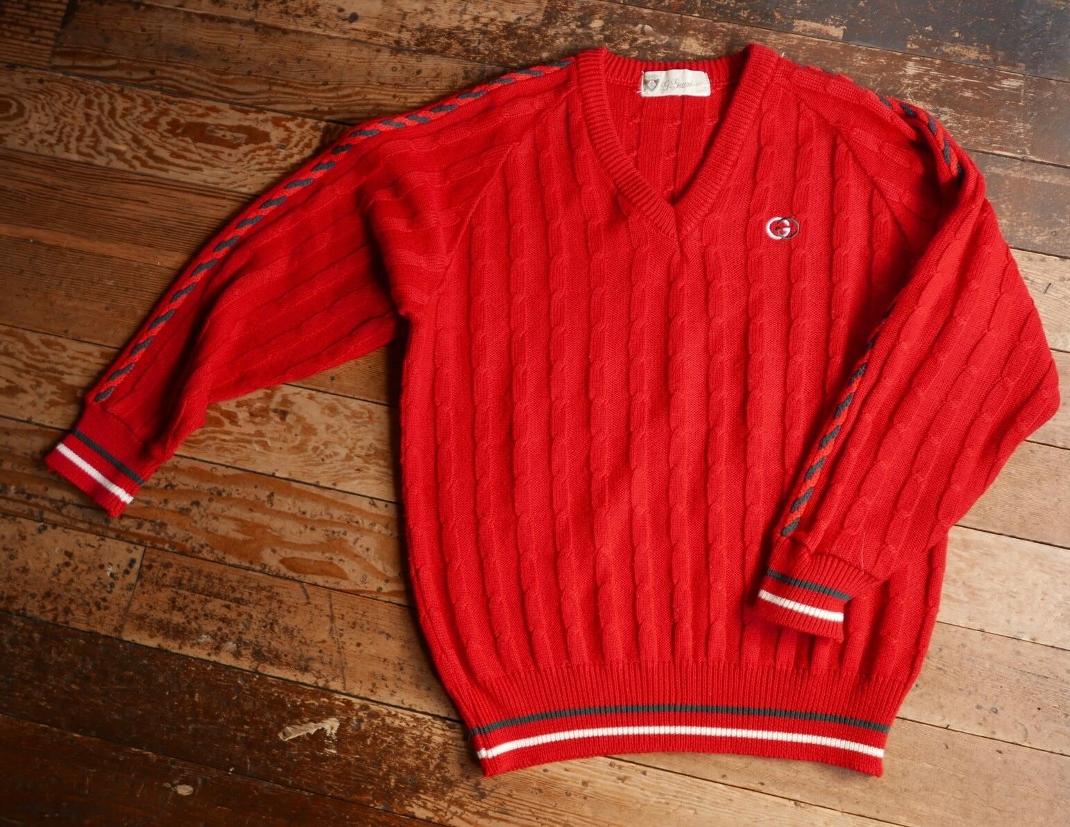 真っ赤なレッドベースに胸元の"GG"ロゴ刺繍がポイントなGUCCI 70~80's Vintage ケーブルニット。