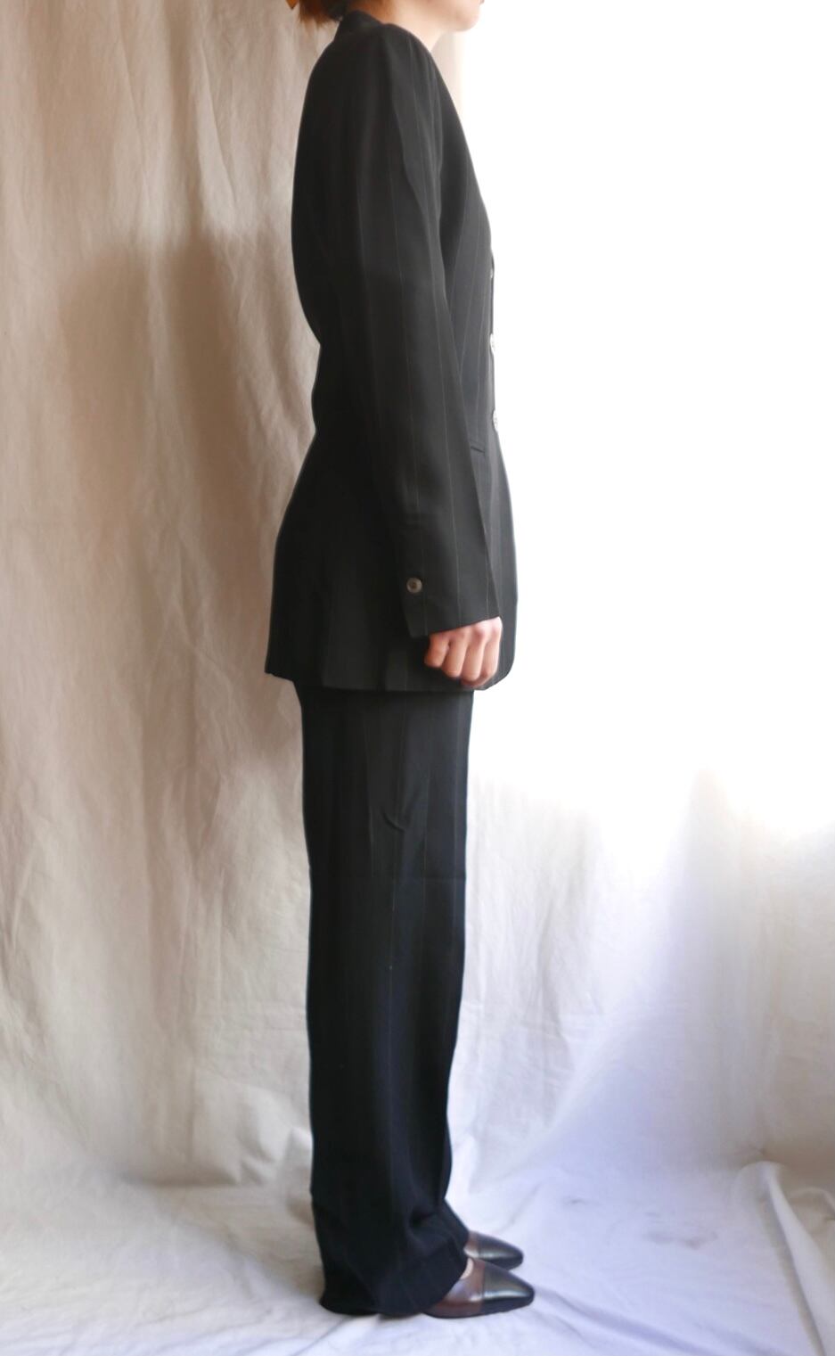 パンツもオーセンティックなスラックスタイプで、着回しのきく一枚です。