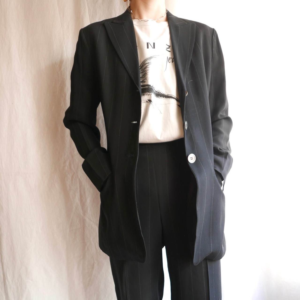 ジャケットは長めの丈感でウエスト部がキュッとしまったライン