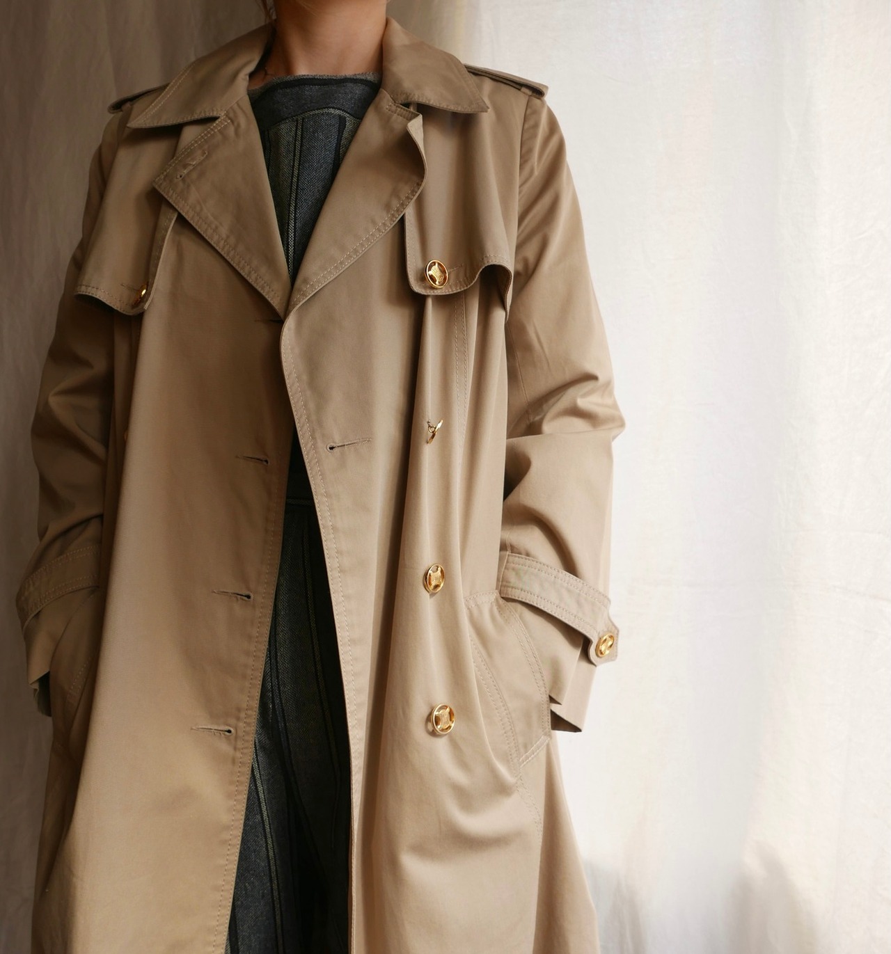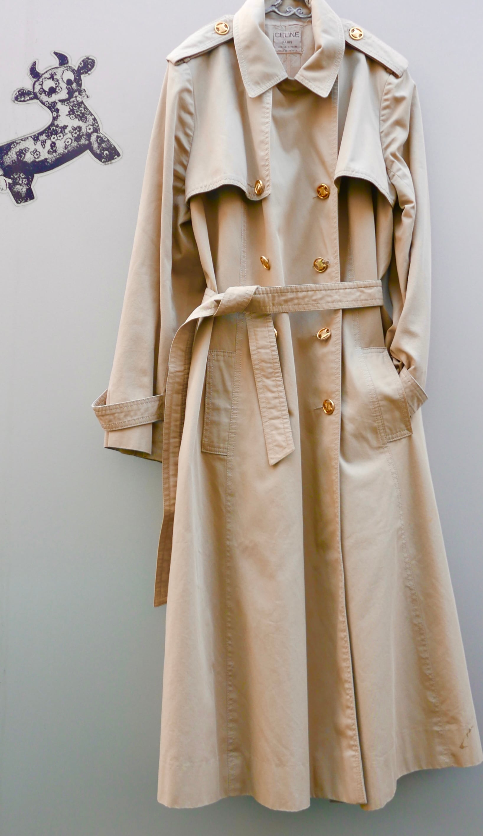 落ち着いたカーキがかったベージュ色にゴールドのマカダムボタンが効いたCELINE 70's Vintageトレンチ