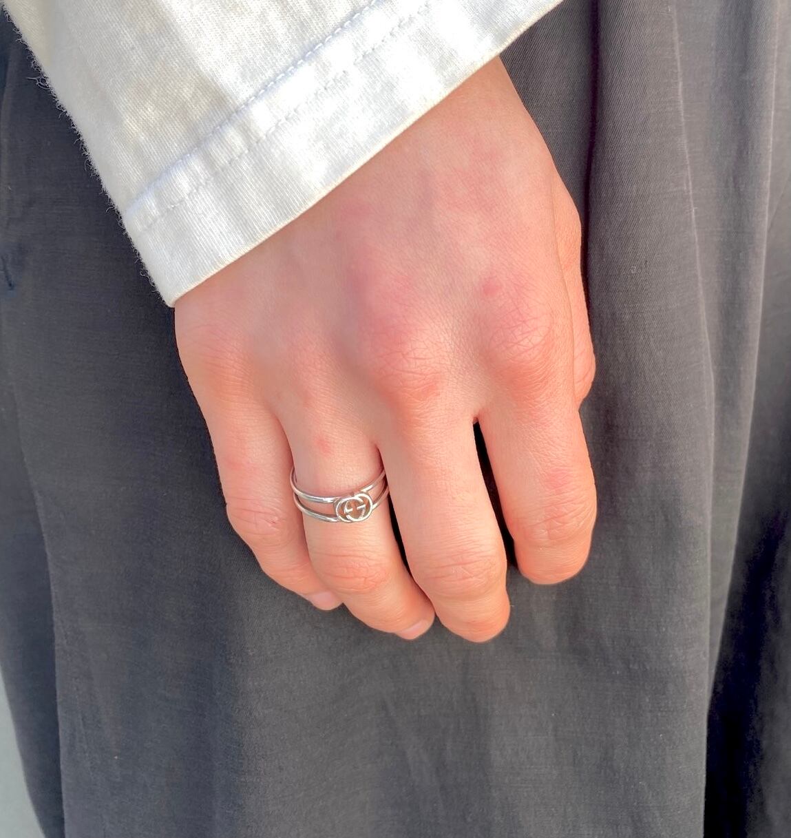 小さなGGロゴとくり抜きのベルトデザインが控えめなかわいさのGUCCIシルバーリング!