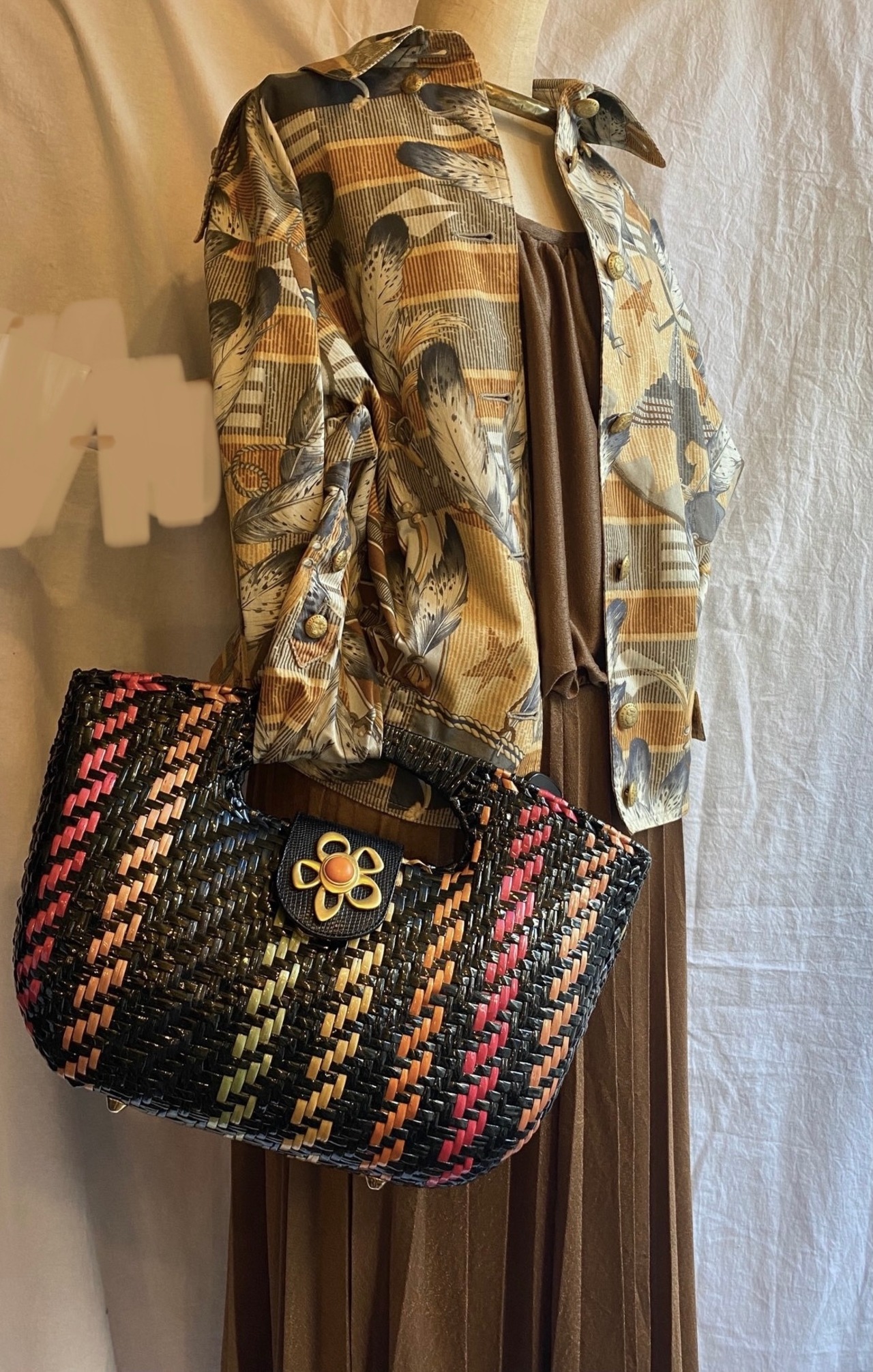ブラックベースにマルチカラーラインがアクセントに効いたItalyラタンハンドバッグ!