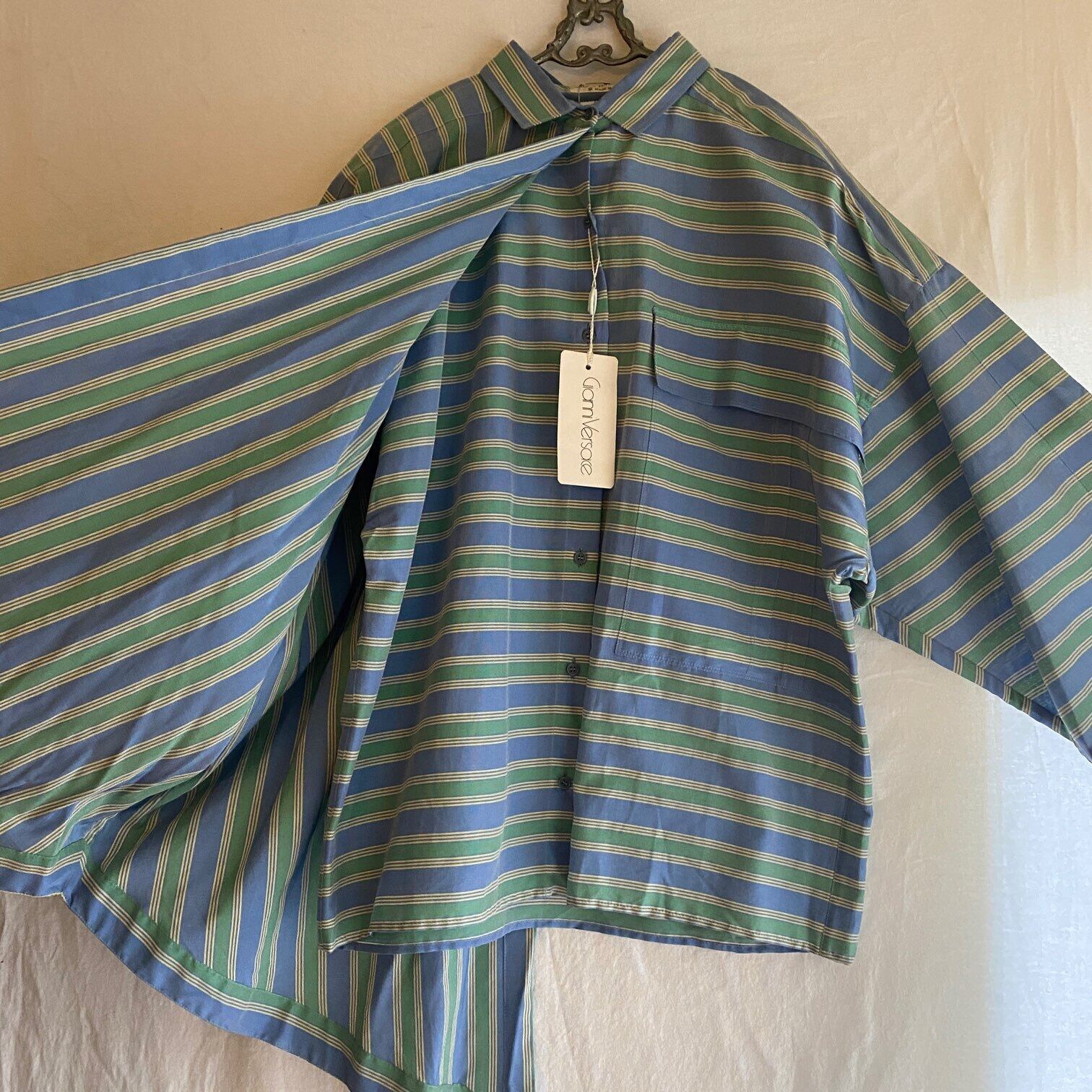 淡いブルーとグリーンのボーダーがとっても爽やかながら、ドルマンスリーブにレイヤーデザインがさすがの攻め感☆
