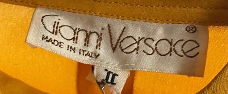 深みのあるイエローとブラウンのモードなVERSACEシルクブラウス。