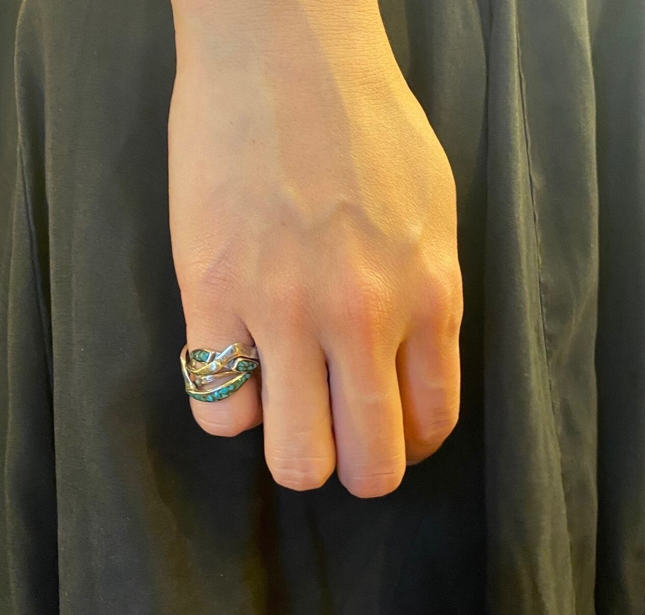 一つ一つの形がランダムで、複雑で動きのデザインが魅力のストーン×シルバー4連リング!
