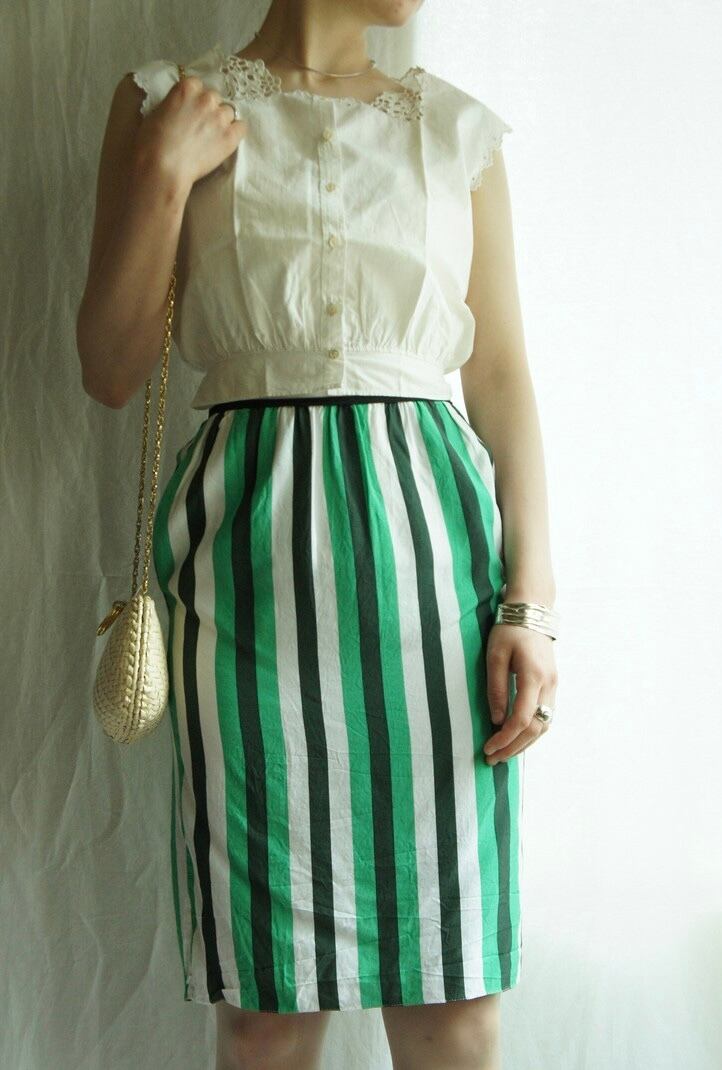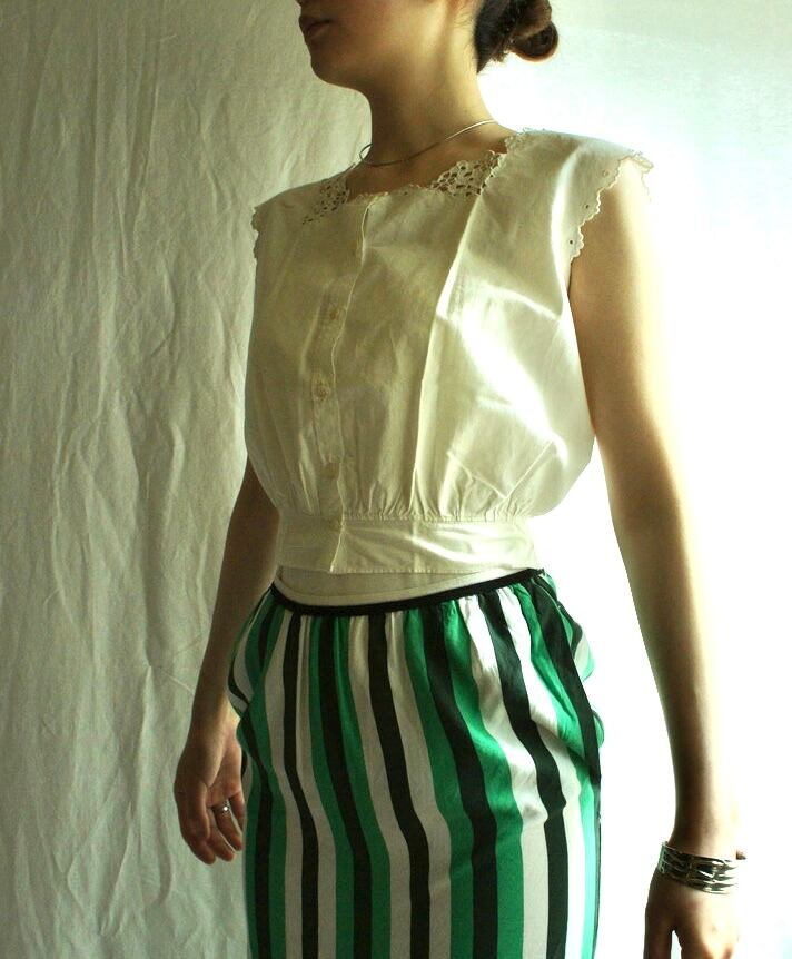 ウエストの繊細なギャザーがコルセットシルエットで、あまり肩が出過ぎないスリーブ。。この年代のキャミソールトップスのなかでは、とても着やすい形です。