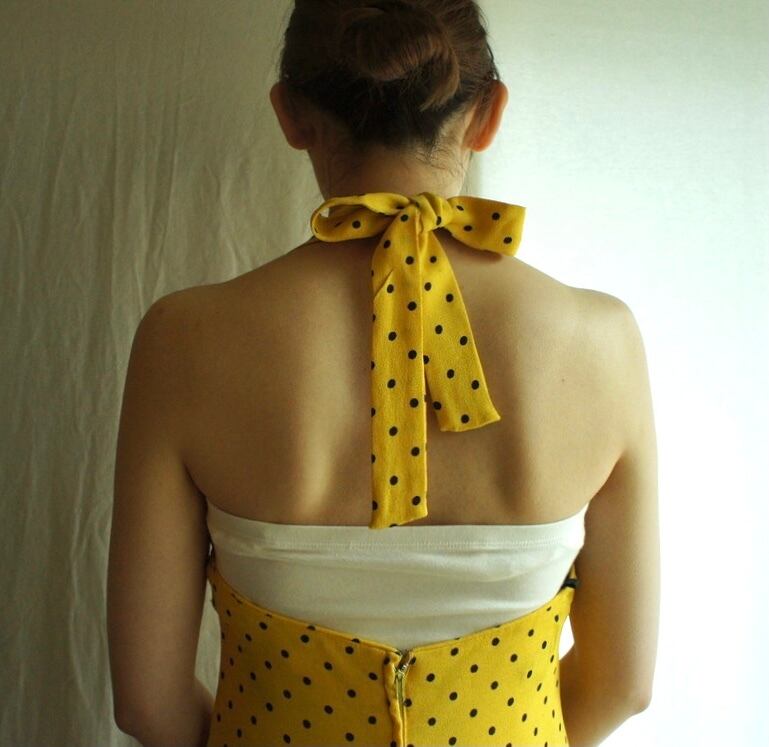 ホルターネックから流れるように広がるフレアラインがうっとりするほど美しい、うっとり。。!真ん中に付いているタイも、クールな演出です。