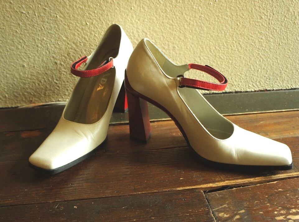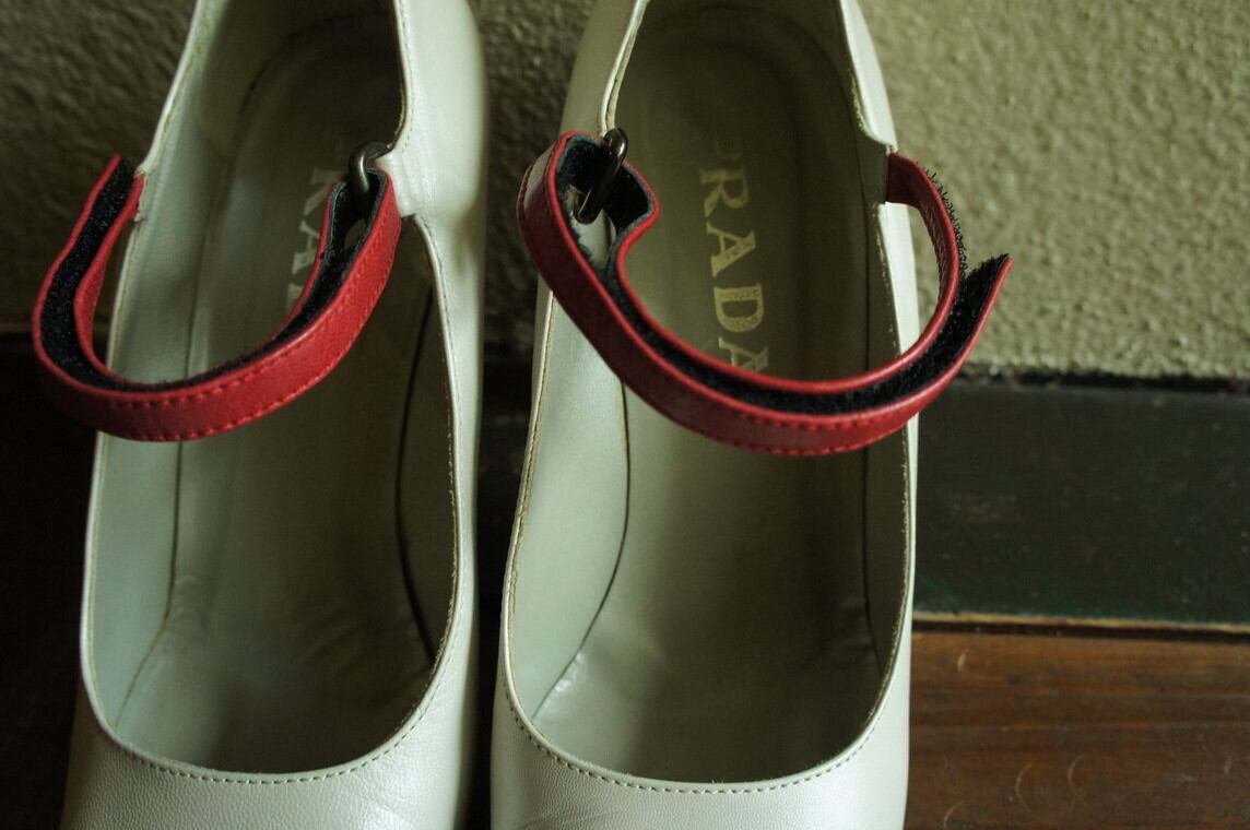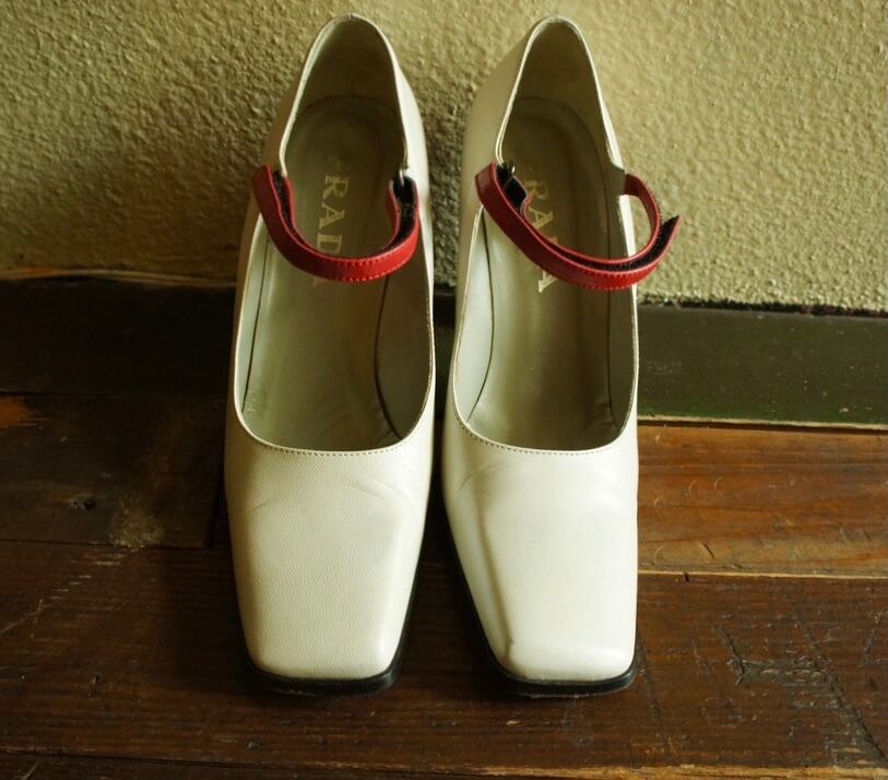 シャイニーホワイトカラーに赤のラインが映えるPRADAハイヒールパンプス!