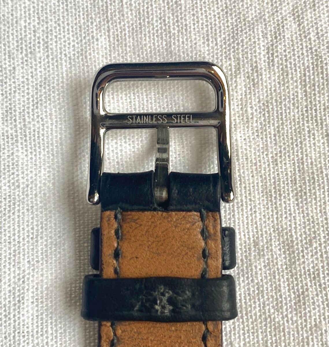 メタリックシルバーにブラックレザーベルトが引き締まった印象