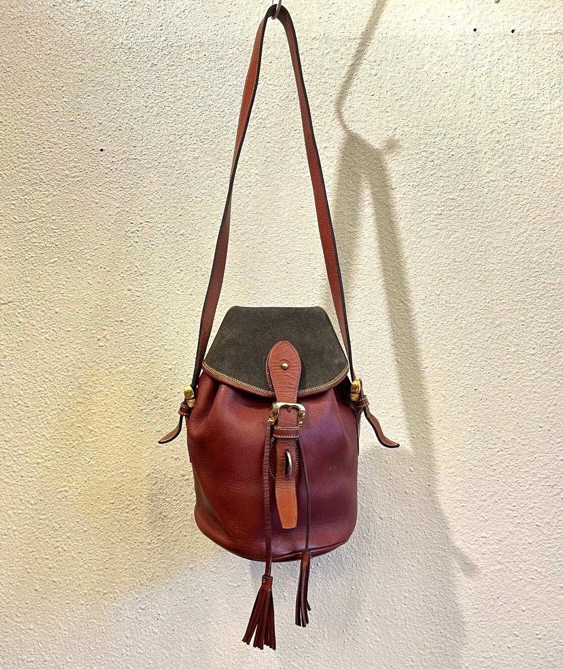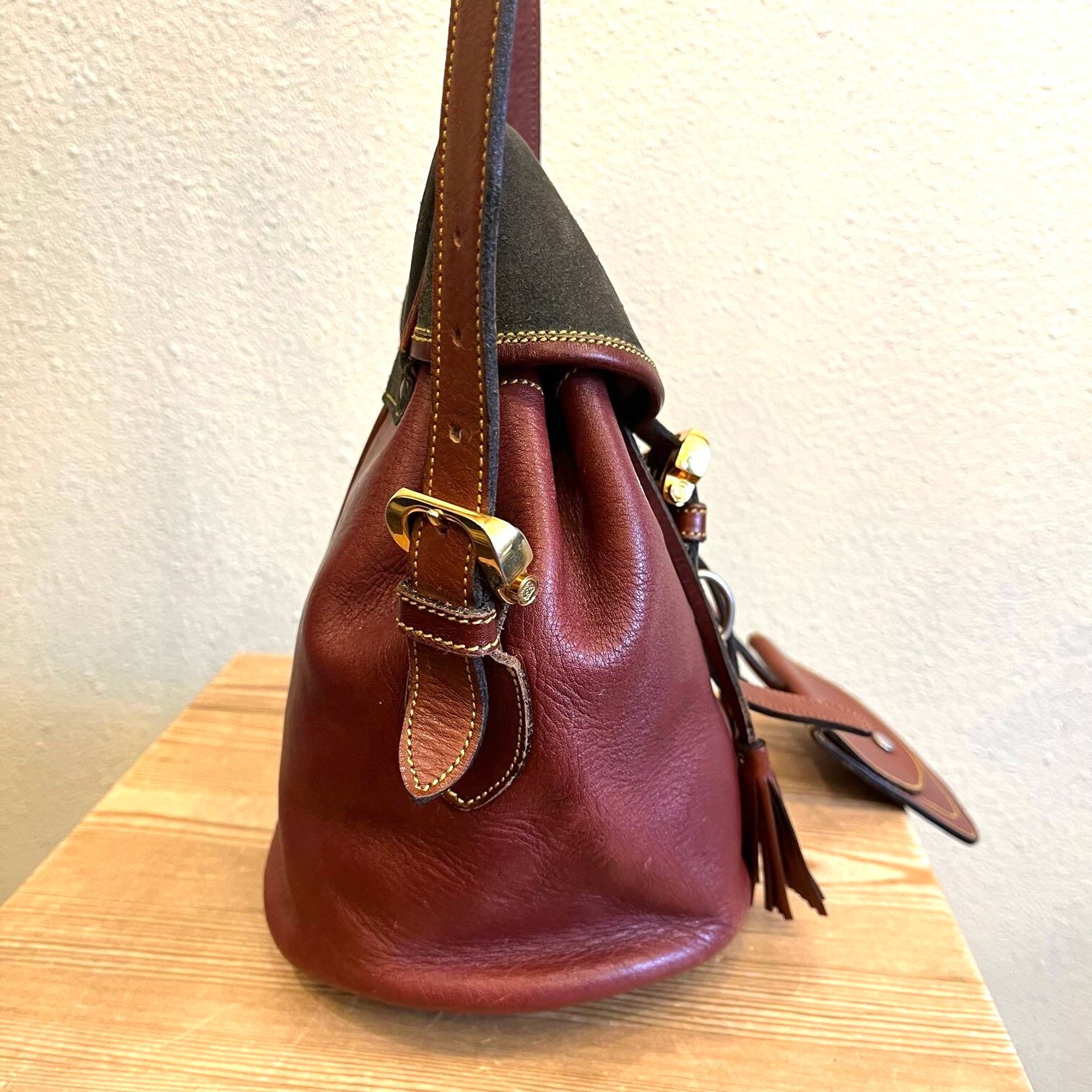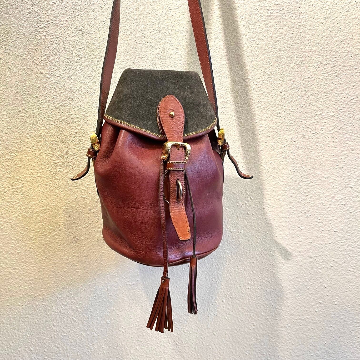 赤みがかったブラウンレザーとカーキスエードのバイカラーが秋らしいLOEWEのショルダーバッグ!コインケース付き☆