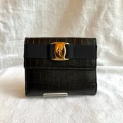 クロコ風のBlackレザーにゴールドのヴァラデザインがcuteなFERRAGAMO折りたたみ財布☆