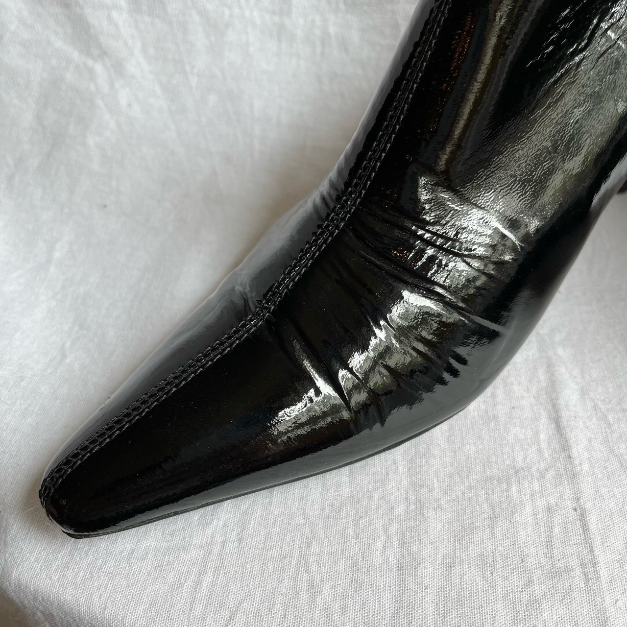 ブラックのエナメル地が都会的な雰囲気のPRADAのショートブーティー!