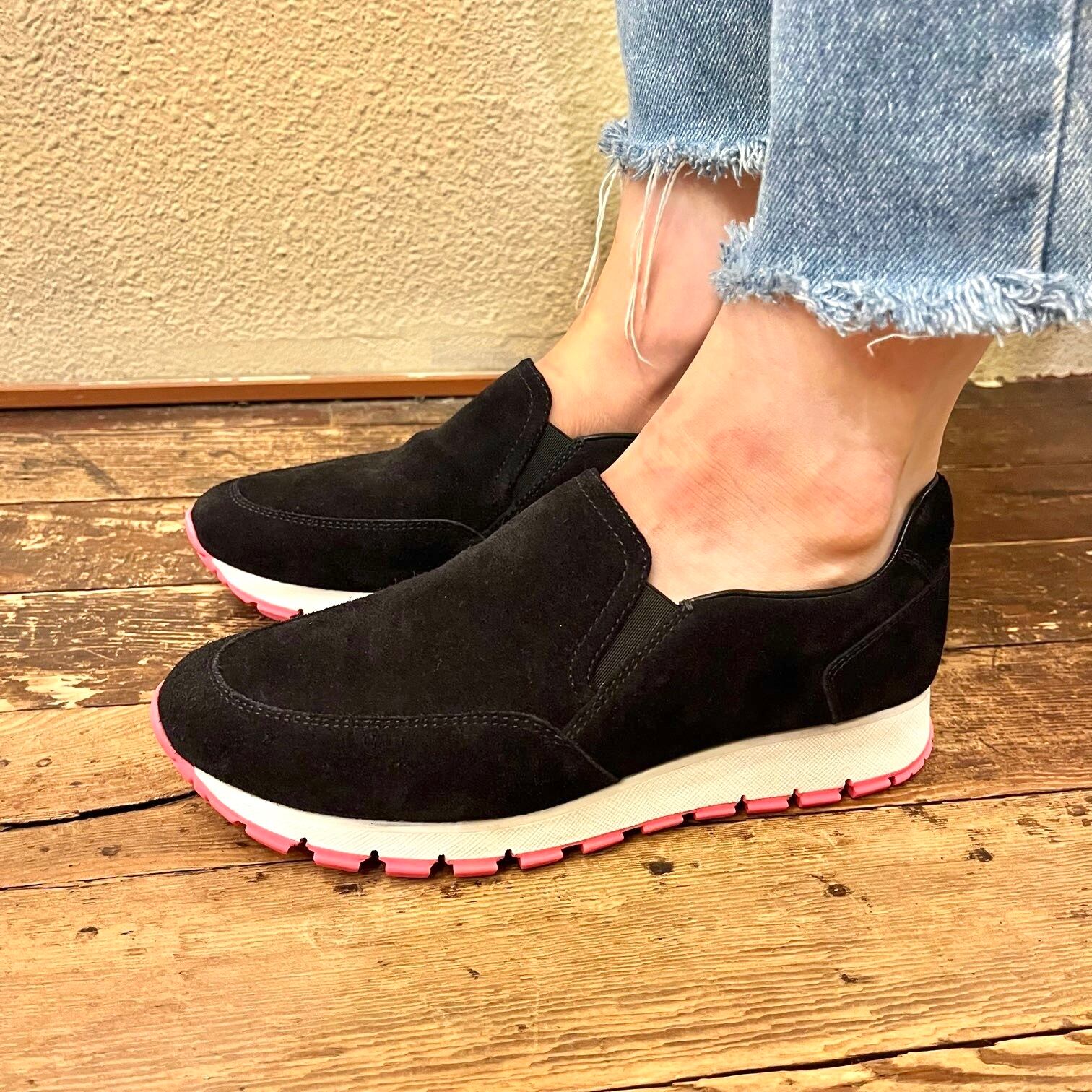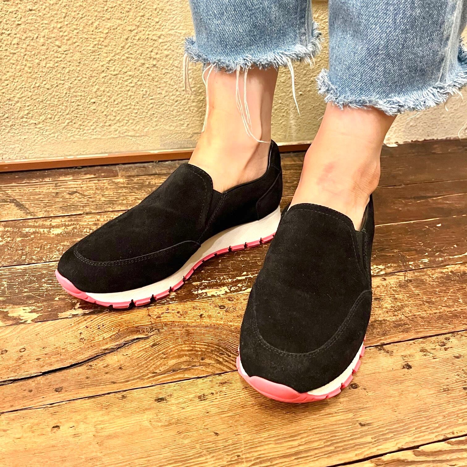 ピンクのソールが目を惹くPRADAのブラックスエードスリッポン!